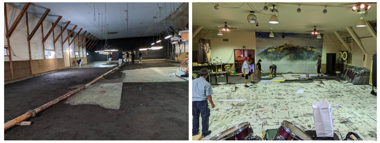 再建のために土間打ちする織物工場とスタジオの復旧作業するバンドメンバー