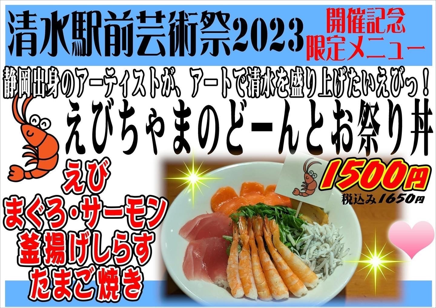 第一回清水駅前芸術祭では、みやもと河岸の市店さまのご協力の元、芸術祭開催期間中にコラボメニュー「えびちゃまのどーんとお祭り丼」を提供していただきました!