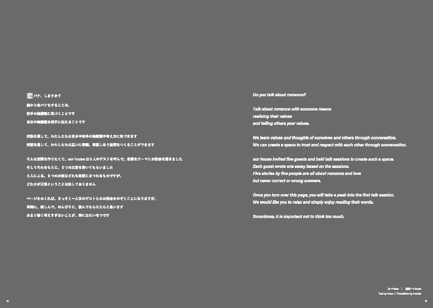 our houseは、あえてその1人では表現しづらい「恋愛」に注目し、既存の恋愛観や規範に縛りつけることなく、多様な人々とお互いを尊重し合いながら、自由に恋バナを楽しむためのマガジンを制作することを決意しました。