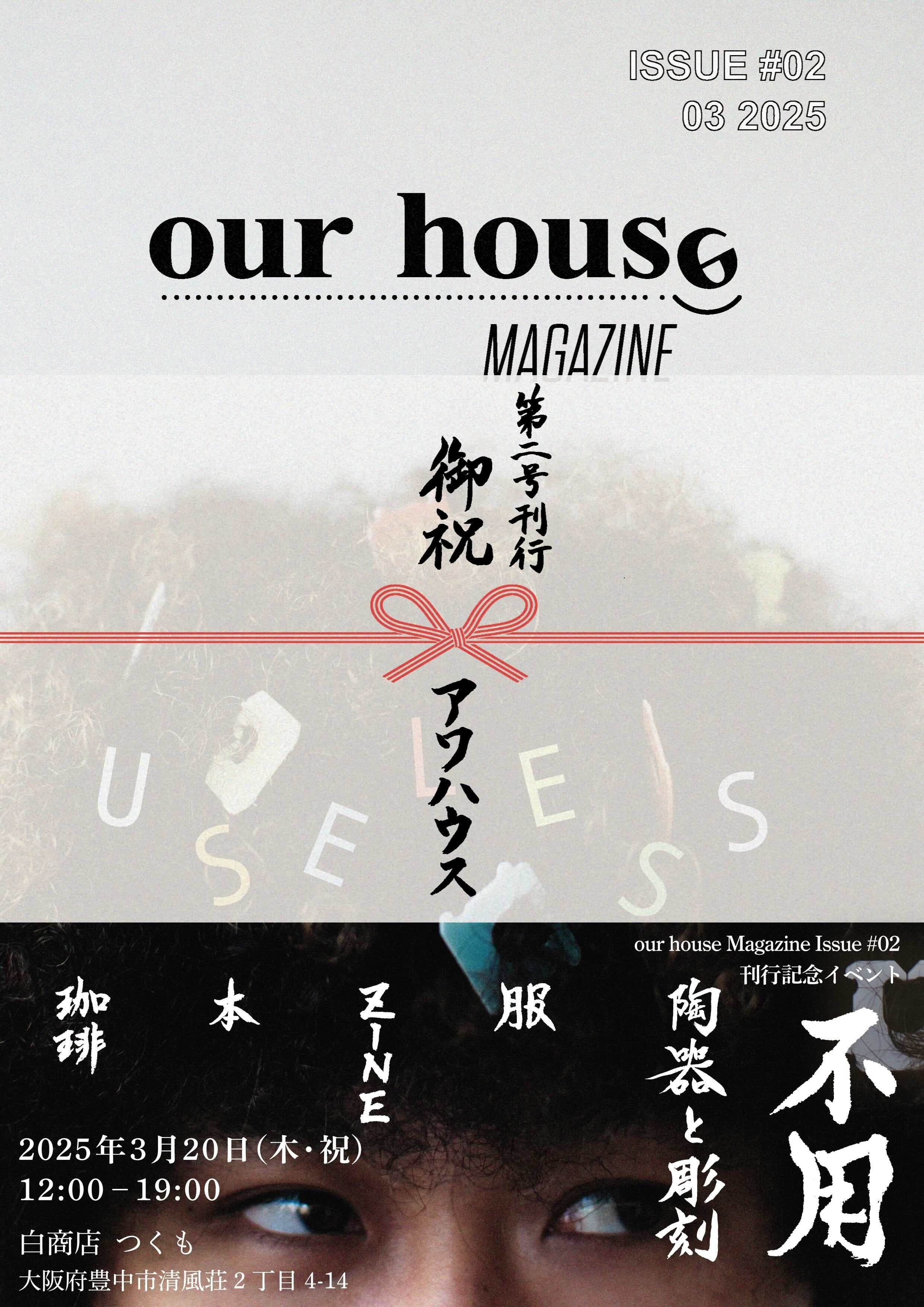 2025/03/19 12:09明日3/20(木・祝)は第二号刊行日いよいよ、our house Magazine issue#02は、春分の日である3月20日(木・祝)に刊行します!!第一号刊行から約一年。無事に第二号を刊行できるのか不安でいっぱいでしたが、クラウドファンディングを通して支援してくださったみなさま、制作に協力してくださった方々のおかげで、無事に完成した第二号がお家に届きました。ご協力、本当にありがとうございました。第二号刊行記念イベントそして、刊行と同時に大阪府豊中市清風荘にある「白(つくも)商店」(Instagram @tsukumosyouten )にてローンチイベントを開催いたします!our house編集部も何度もお世話になっているお気に入りの場所でローンチイベントを開催できることが本当に嬉しく、ワクワクしています。以下は出展者一覧です。(順不同)- - - - - - -our house Magazine第二号刊行記念イベント- 陶器と彫刻 フベン(Instagram @fuben_paddling)- 古着 TAIAN (Instagram @taian_osaka)- 選書 古書みつづみ書房 (Instagram @mitsuzumishobo)- ZINE すえつ(Instagram @_suetsu)・ハナ(Instagram @swiu.n)・ハルカ(Instagram @haruchee.ii)- 珈琲・雑貨 テニヲハヲコト、(Instagram @teniwoha_wokoto)◉とき 2025年3月20日(木・祝) 12:00–19:00◉ところ 白商店 (大阪府豊中市清風荘2丁目4ー14)(阪急宝塚線・石橋阪大前駅 西改札口より徒歩7分)- - - - - - -当日は、白商店にある古着屋「TAIAN」や「喫茶ねりね」にもご協力いただきます。TAIANには、テーマ「不用」に合わせた古着のセレクトを、喫茶ねりねには、イベント限定の¥1000プレートを先着20名限定でご用意していただきます。TAIANの店内画像喫茶ねりねの特別プレート第二号にも寄稿してくださったライフカルチャーメディア「テニヲハヲコト、」さん。「てにをは」によって前後の名詞や動詞の関係性が変わり、意味やニュアンスが変化するように、生活における接続助詞として自然環境と人間社会の関係性を時代の文脈に合わせて調整し、美しい地球や暮らしの生態系を次世代へ繋げることを提案しておられます。イベントでは、自家焙煎珈琲やセレクト雑貨を販売していただきます。第二号で取材に伺った鳥取県湯梨浜町で陶器や彫刻を制作する「フベン」さん。便利さにとらわれない、手でつくられたあたたかさが魅力な作品を制作されています。当日は委託販売ですが、マガジンの特集を読みながらぜひ作品に触れてみてください。フベン販売予定作品、第一号とともに兵庫県伊丹市にある古書店「古書みつづみ書房」さんにはテーマに沿った選書をしていただきます。マガジンだけでなく、他の分野の書籍からも「不用」について考えるきっかけになれば嬉しいです。古書みつづみ書房当日はZINEも販売します!第二号に寄稿してくださった「すえつ」さん、そしてour house編集部のハナとハルカのZINEが並びます。すえつさんのZINEour houseのマガジン第二号を誌面だけでなく、体感してもらうためのイベントです。「不用」をいろんな視点でお楽しみいただけますように。では明日、白商店にてみなさまのお越しをお待ちしております。our house もっと見るご支援のお礼