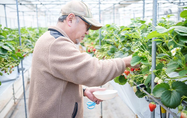 橘農園様のいちごは、無農薬で子どもたちも安心して食べられます。味も濃厚・形も良く、いちご狩りに海外からもお越しいただくなど、新たな観光スポットにもなっています。