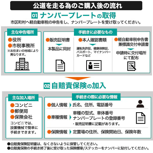 A. 必要です。インターネットやコンビニ、郵便局、保険会社にて加入手続きが可能です。ナンバープレート取得時に渡される交付証明書と販売証明書を持って行ってください。