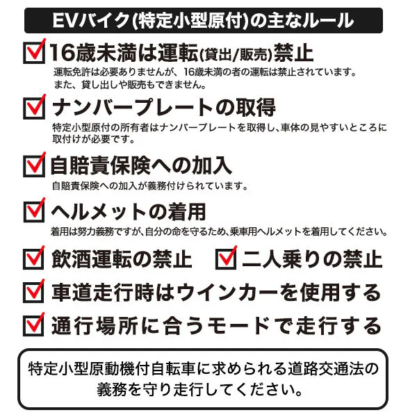 ・特定小型原動機付自転車を16歳未満の者へ貸出し及び転売をしてはいけません。転売等をした場合は道路交通法違反として罰則が適用される可能性があります。