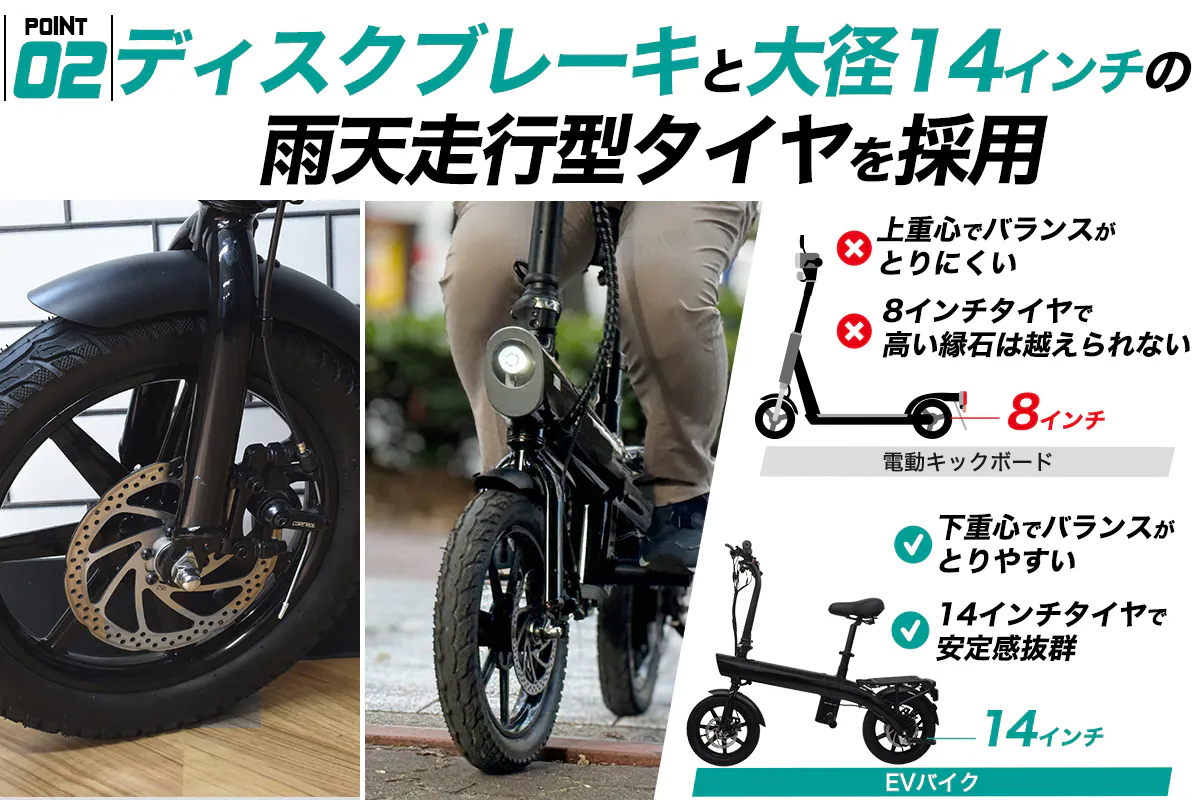 ・ディスクブレーキと大径14インチの雨天走行型タイヤを採用
