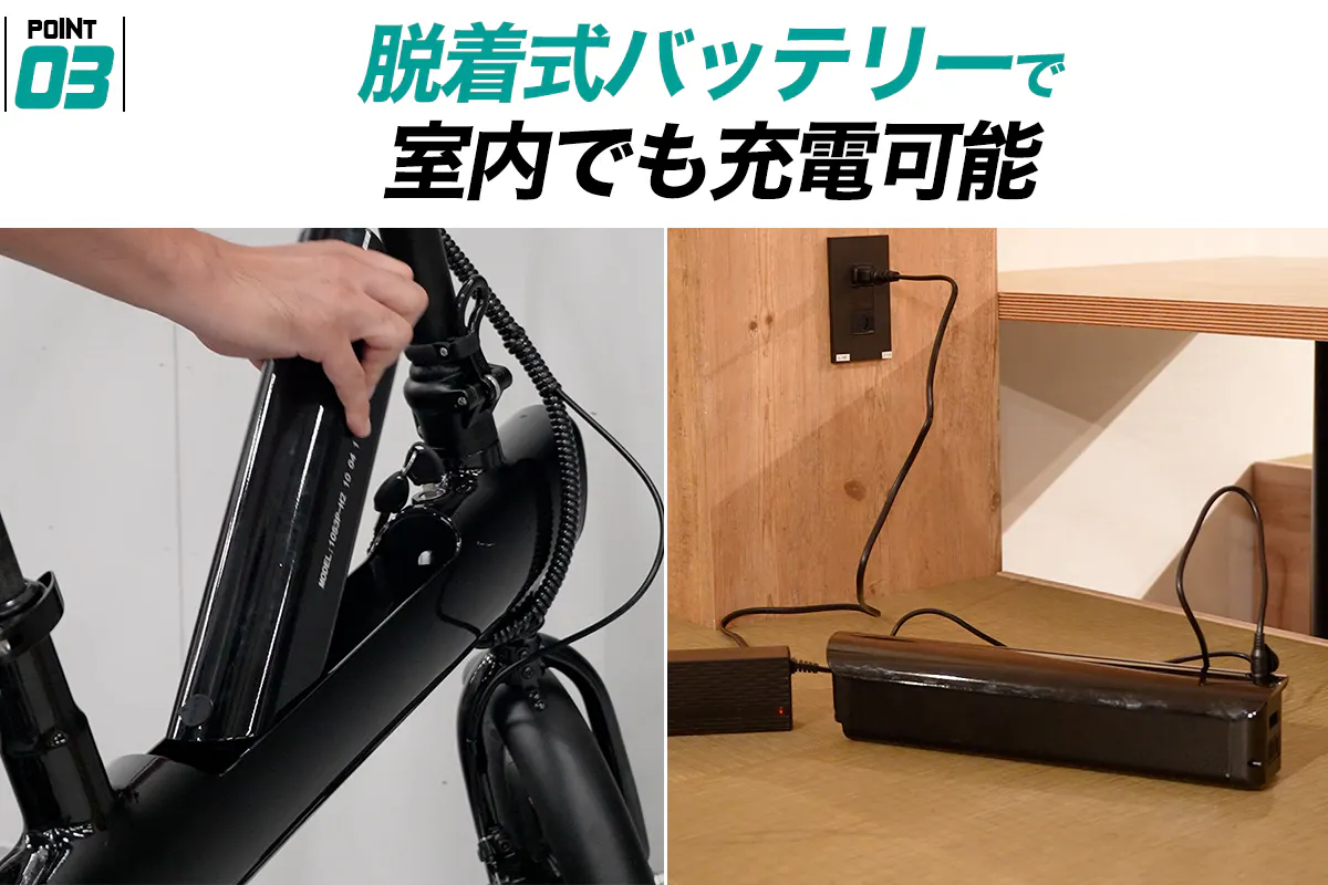 ・脱着式バッテリーで室内でも充電可能