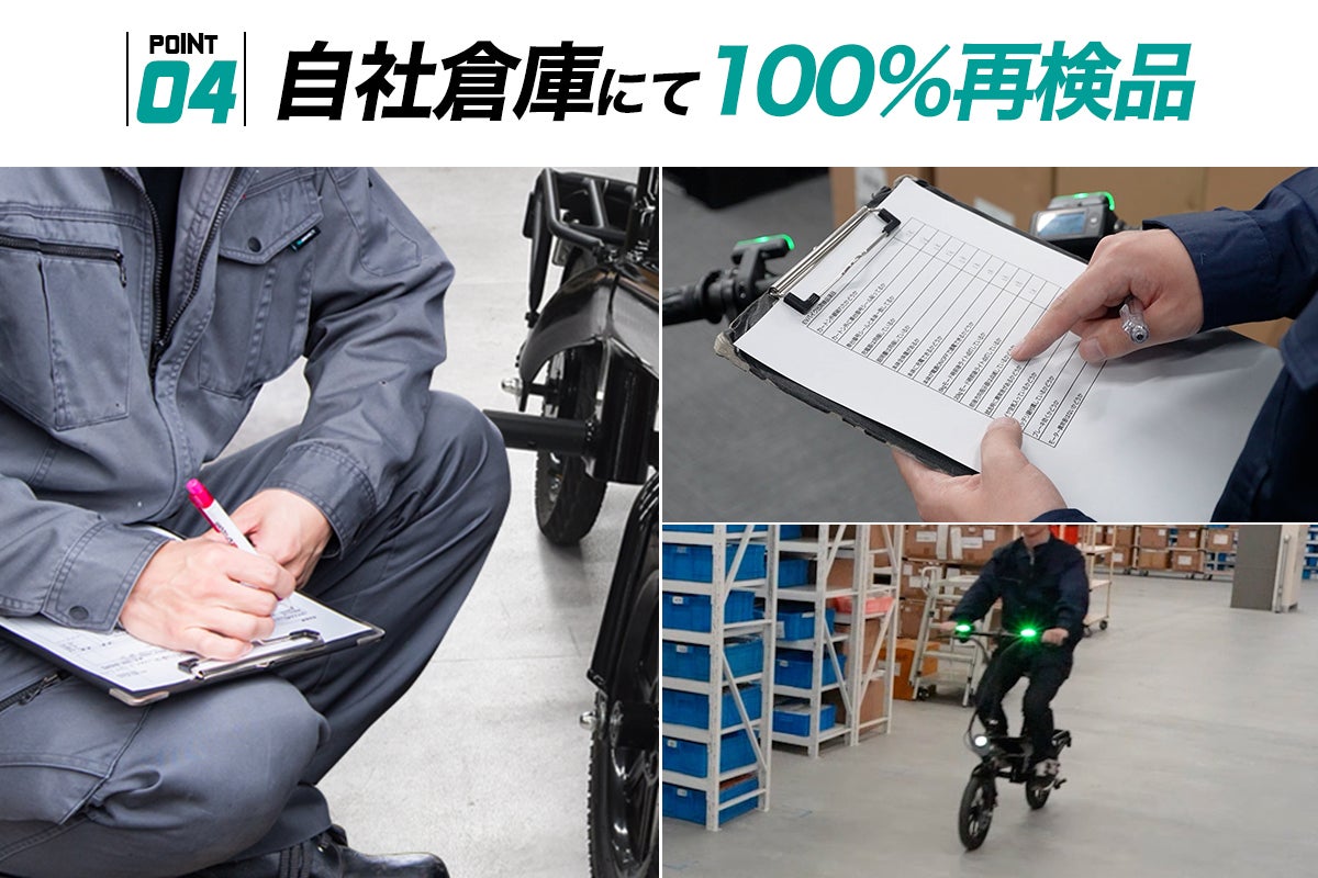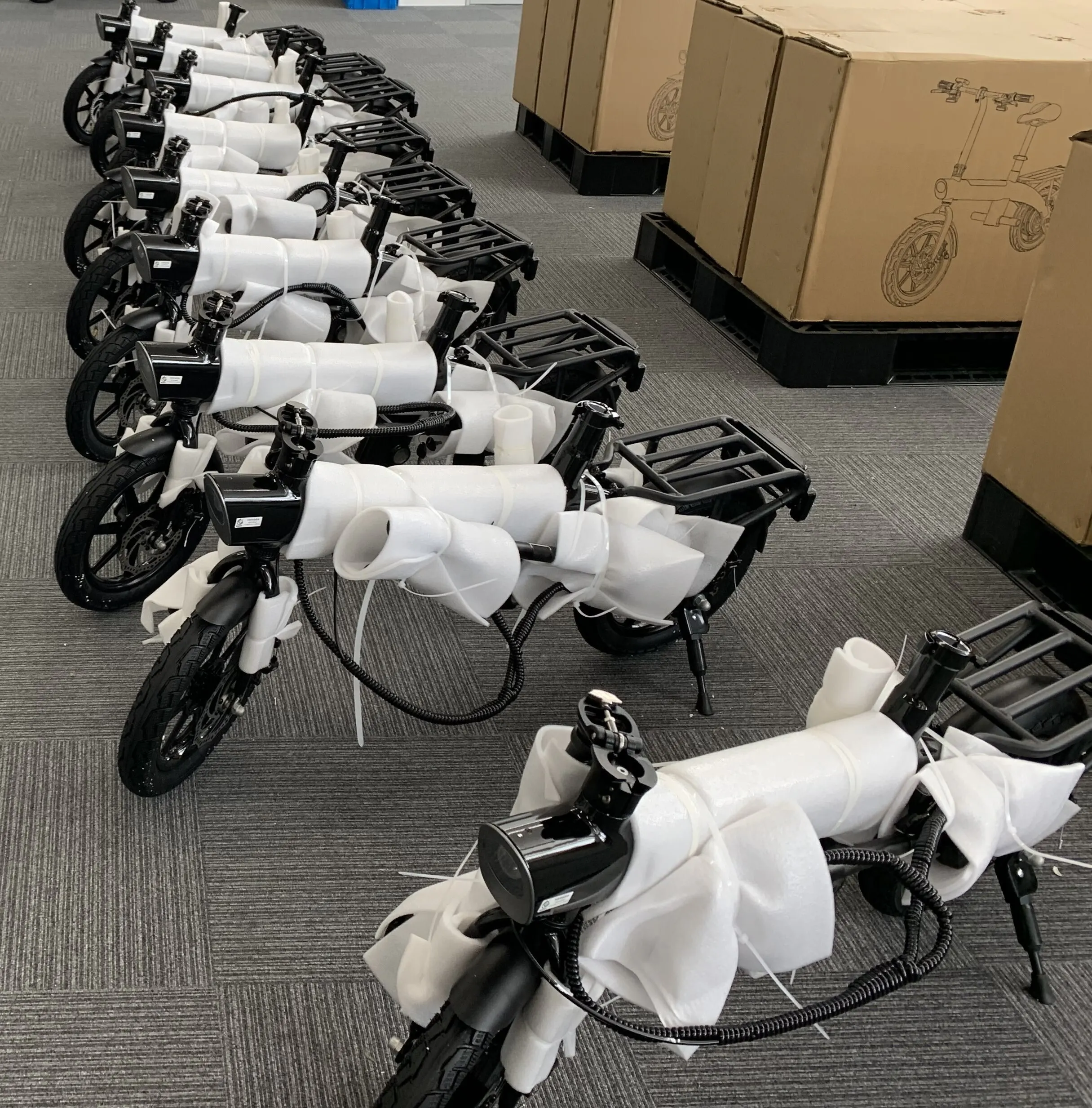 皆様に安心して乗車していただけますように、ライトの点灯、モーターの動作、ブレーキ部分(キャリパー、ワイヤー等)の調整・確認をする等、1台1台の検品を弊社倉庫にて行っており、配送準備も着実に進んでおります。