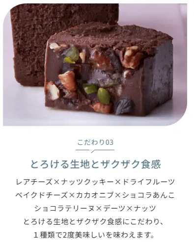 なめらかな口溶けと深いコク、新鮮な生乳からつくられた“北海道産クリームチーズ”を主役に、“ドライフルーツ”や”あんこ”などこだわり素材の組みあわせが織りなす、ウィットにとんだ味わいや食感をお愉しみいただけます。