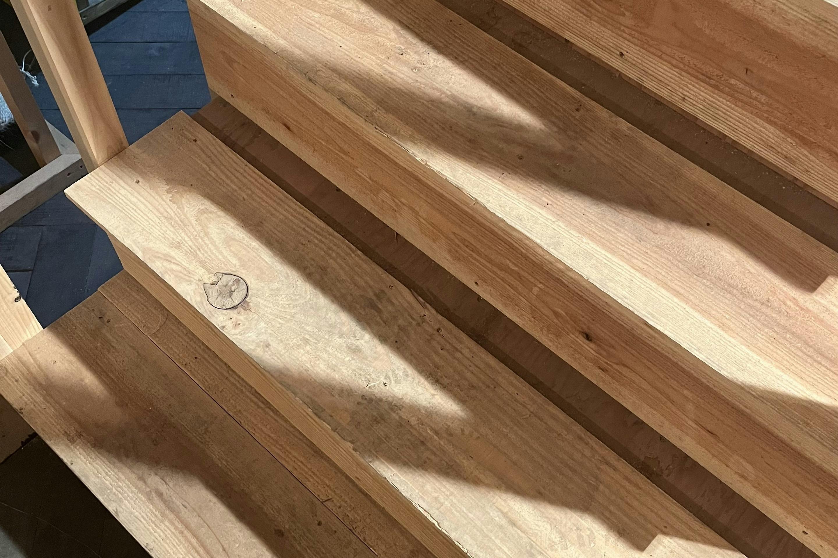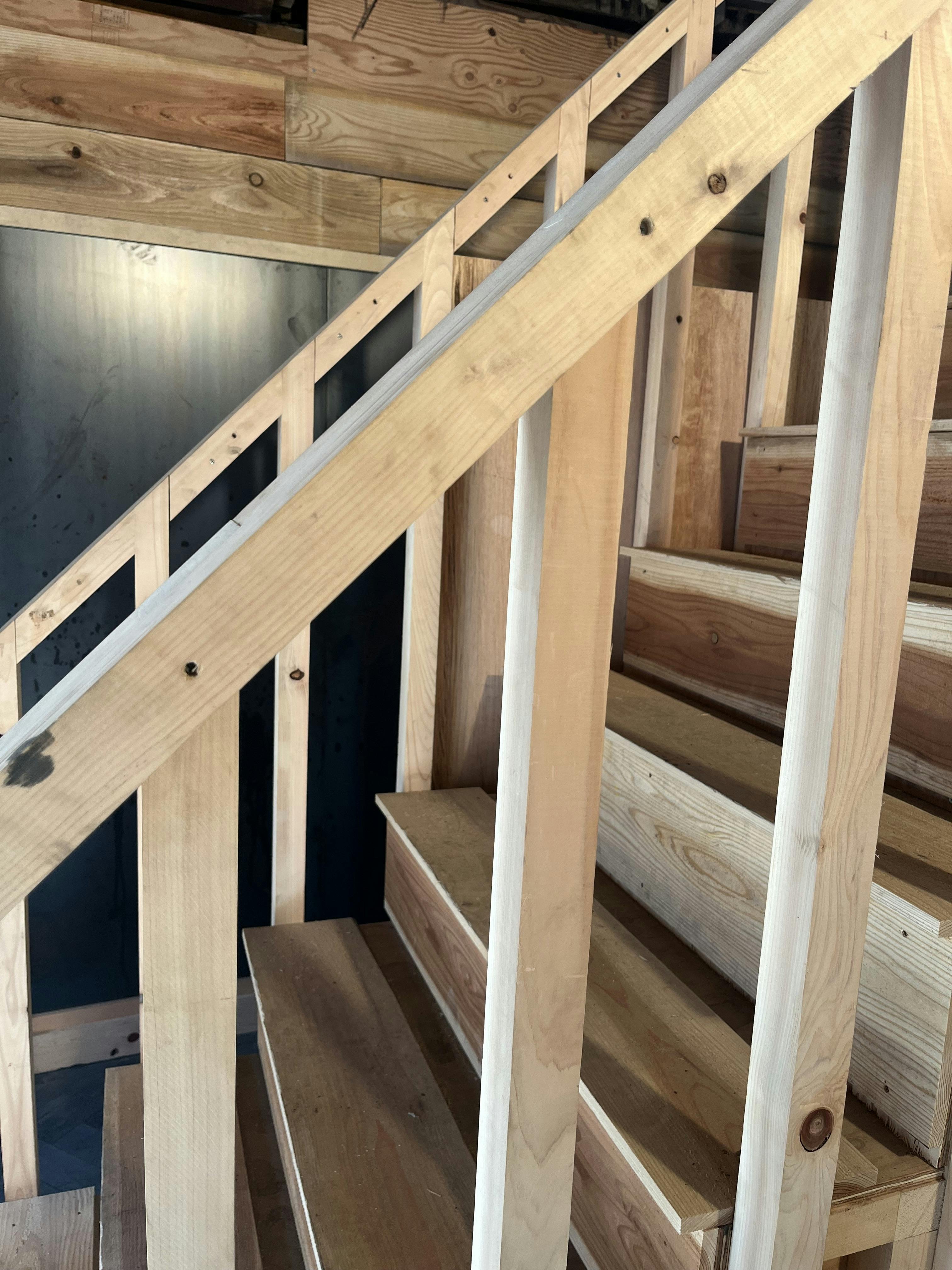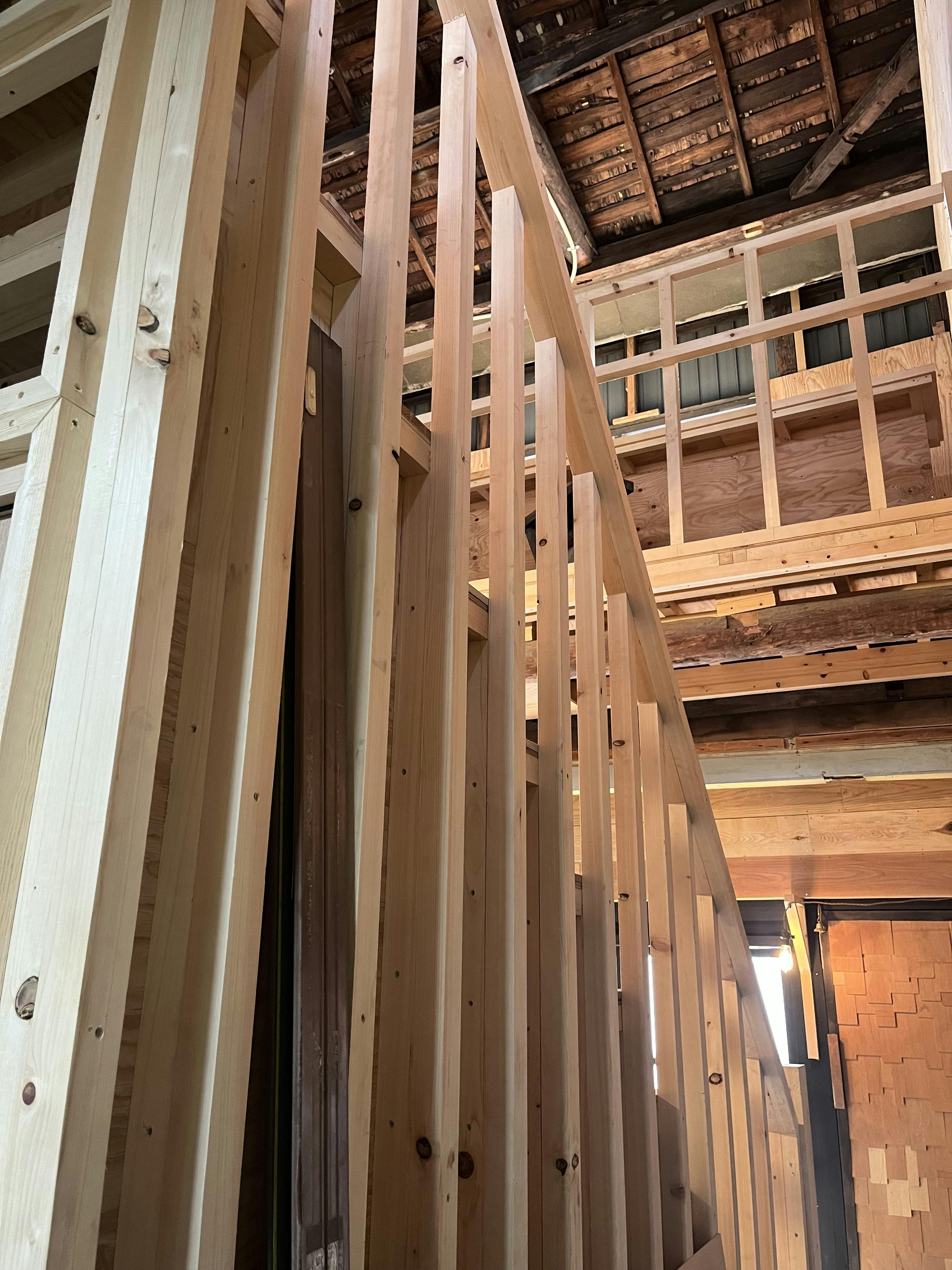 職人さん曰く、池田屋事件の「階段落ち」や、閣僚が並んで並んで写真を撮る首相官邸の大階段をモチーフにして、空間を広くとるために左右いずれかに寄せることなく、敢えて真ん中に階段を設置したとのこと。