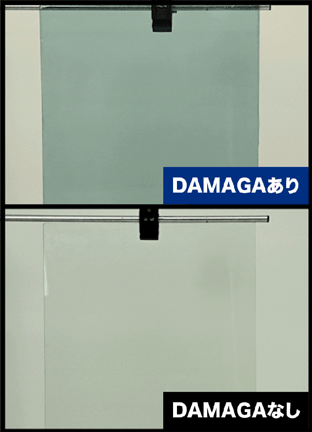DAMAGAなしの瓶よりも、DAMAGAを貼り付けた瓶の方が水滴が小さく流れにくいことが分かりました。
