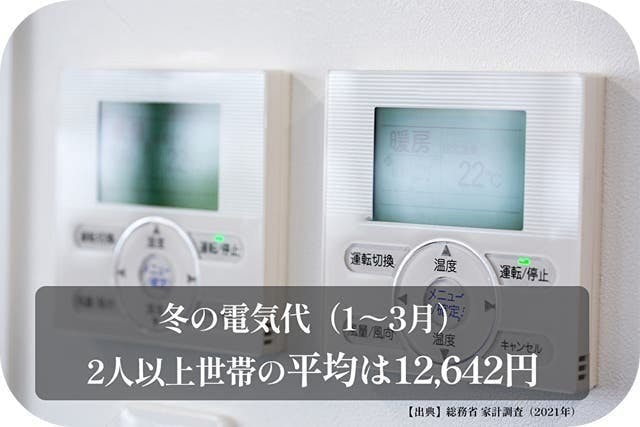 総務省統計局の家計調査によると、2021年の冬(1〜3月)電気代の2人以上世帯の平均は12,642円。 エアコンやホットカーペットなど、暖房器具を使う機会が多い冬は、ほかの季節に比べてどれくらい電気代がかかっているのかも気になるところ。