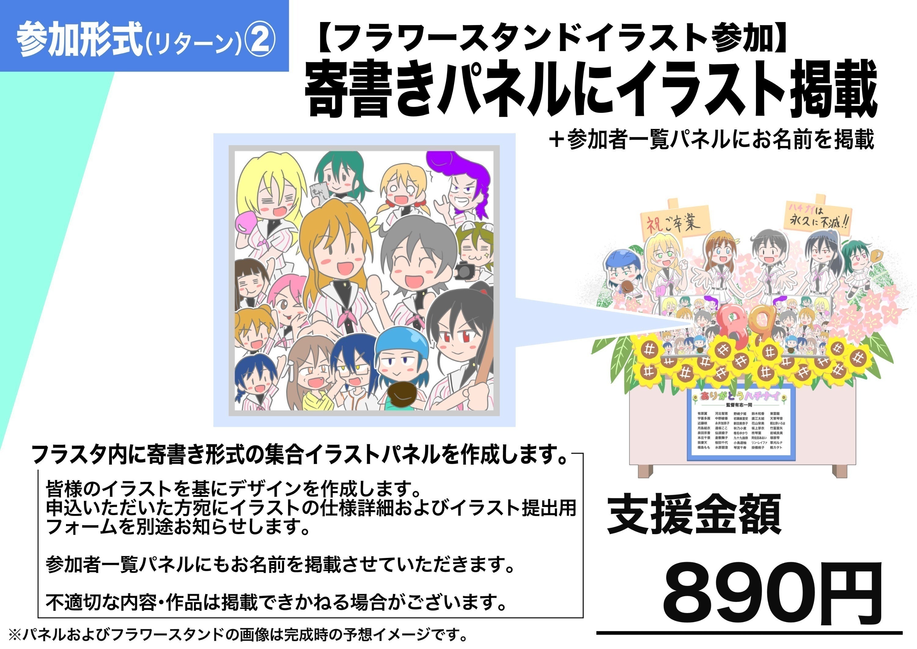 ・本企画の最終目的はアカツキ本社オフィスへのフラワースタンド贈呈ですが、本クラウドファンディングについて作品公式およびアカツキ社は関与しておらず、あくまでもユーザー有志による参加者募集型の二次創作活動の一環である旨ご留意ください。本企画について作品公式への問い合わせ等はお控えください。