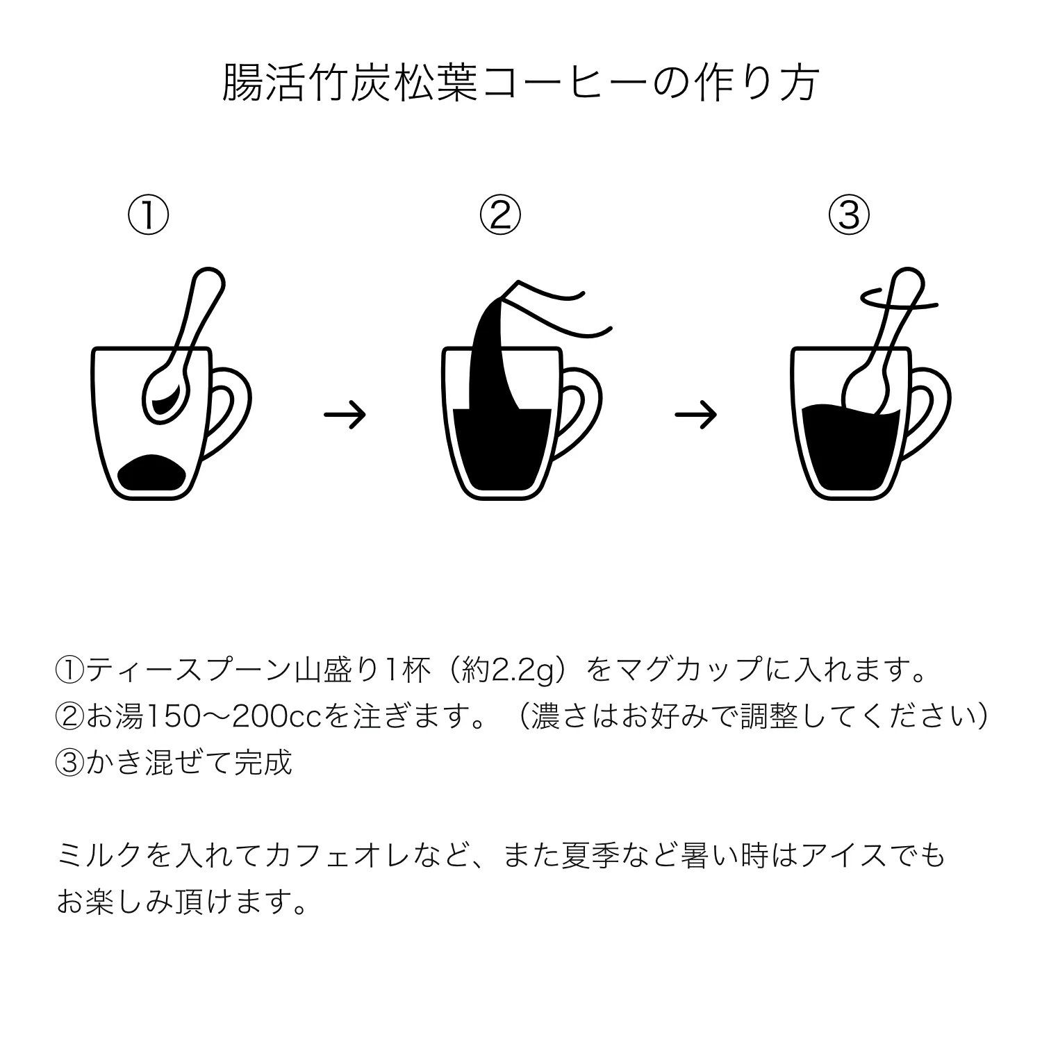原材料:インスタントコーヒー(カフェインレス)、松葉粉末、竹炭粉末