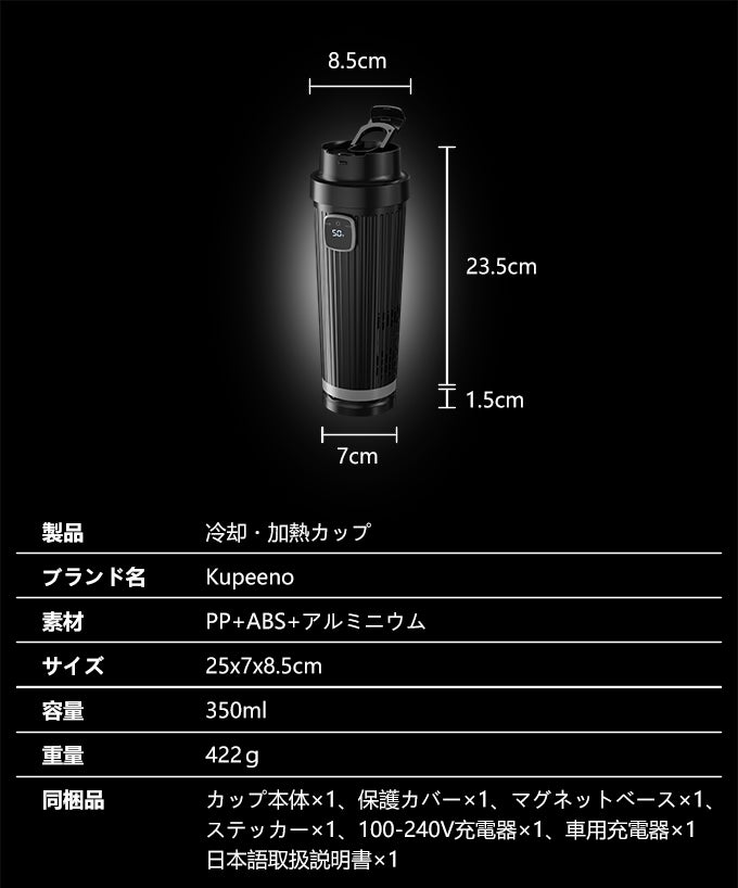 最先端の半導体技術を採用しており、自由に温度を調節できるため、いつでもお好みの温度で飲み物を楽しむことができます。また、350mlの大容量と車載用に最適化されたデザインにより、日常生活はもちろん、車内やオフィスなど多様なシーンで活躍します。