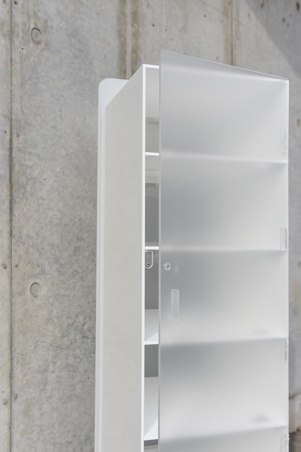 あえてにおいを意識したとき、他の人と空間を共有するのは心理的に抵抗を感じるはず。そこで、靴の収納スペースは、個々の扉を用意して個室感覚で仕舞えるタイプを採用しました。半透明の扉によって、靴が入っているかどうか気配でわかるようになっています。
