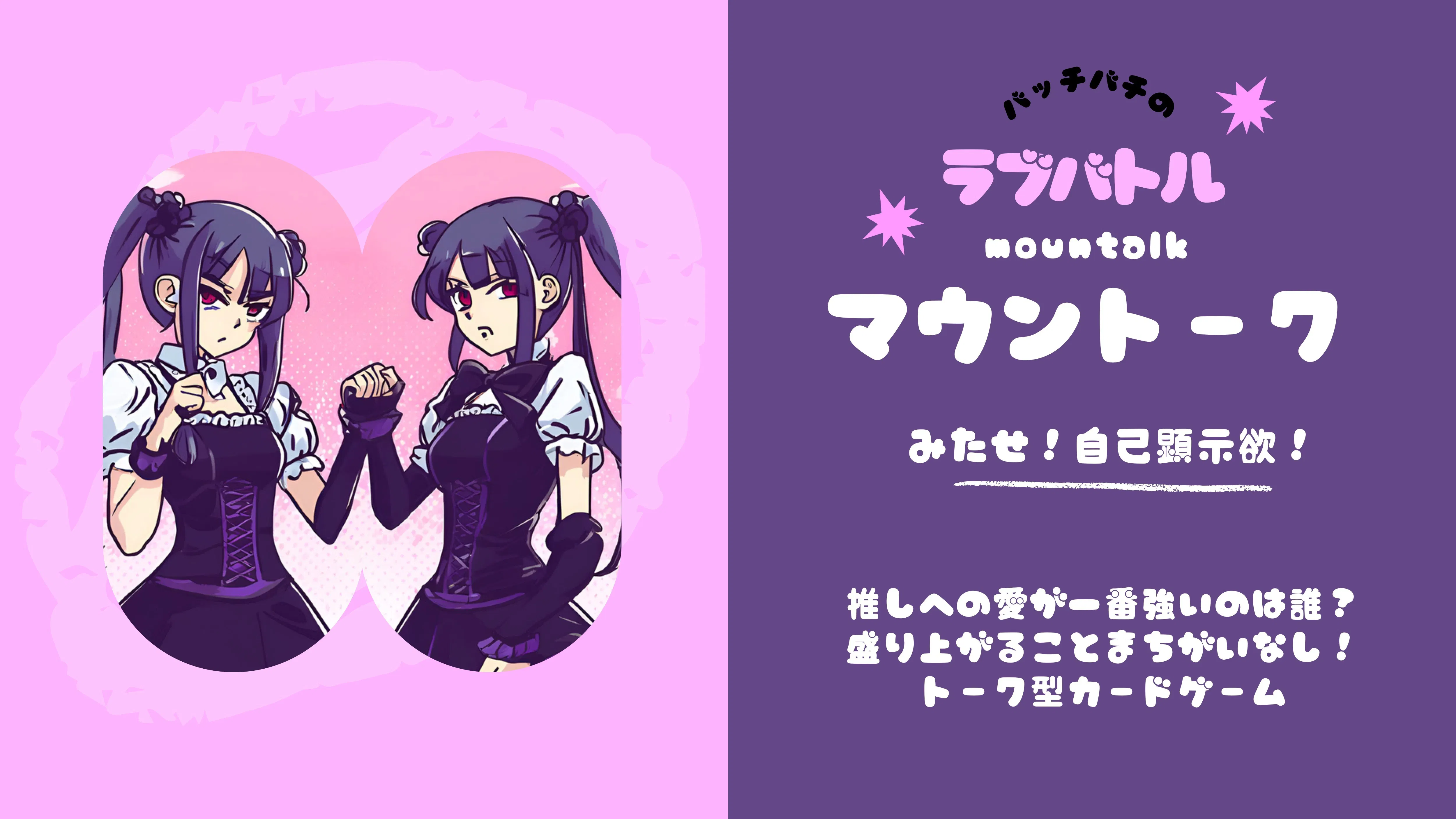 そこで!私達はどの界隈のファンの方々にも共感いただけるでしょう、”オタク同士のマウント”を題材にマウントークというトーク型カードゲームを制作しています。女子会やオフ会などで楽しんでいただけるゲームになると思いますので、少しでも興味をお持ちいただけましたらご支援いただけると嬉しいです。