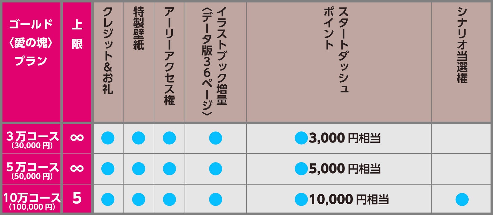 ・リターン(ゴールド愛の塊プラン3種類)を追加しました。