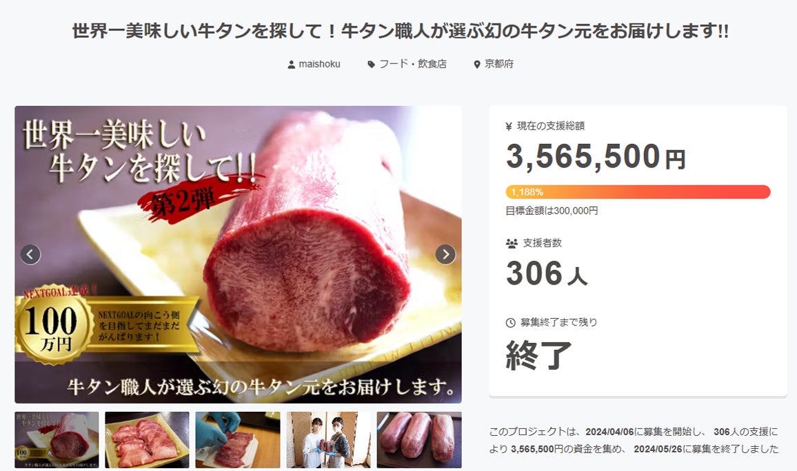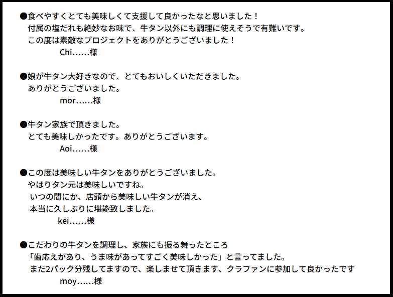 2025/05/17 14:07本日公開!【世界一美味しい牛タンを探して!牛タン職人が選ぶ幻の牛タン元をお届けします!!第4弾】いよいよSTARTしました。お昼ごろにこそッとそわそわしながらページを覗きに行くともう5名の方がご支援してくださってるーーー!!ご支援者様、ありがとうございます。今回のプロジェクトも目玉は「丸々1本の牛タンブロック」ですが、今のところ人気の商品は「霜降り牛タンスライス1.8㎏」のようですね。どの商品の人気がのびていくのか今後の展開からも目が離せません♪しかもリピータのご支援者様の温かい応援コメントが嬉しいです!!リピートしていただけるだけでも嬉しいのに、わざわざ嬉しいコメントまで残していただけるなんて。いつもこちらが皆様から牛タン笑顔をいただいてばかりです。ありがとうございます^^プロジェクトは始まったばかりです。皆様の温かいご支援、シェアなどの応援もどうぞよろしくお願いいたします。『世界一美味しい牛タンを探して!!』 ~牛タン職人が選ぶ幻の牛タン元をお届けします。~ もっと見る