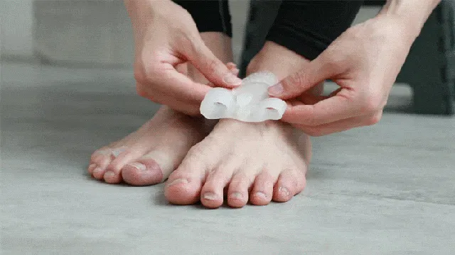 足の指にはめるだけだから簡単です。両足の親指と中指にセットし、装着状態で靴下を履き、歩行時には体重を掛けながら装着部を意識して歩行して下さい。