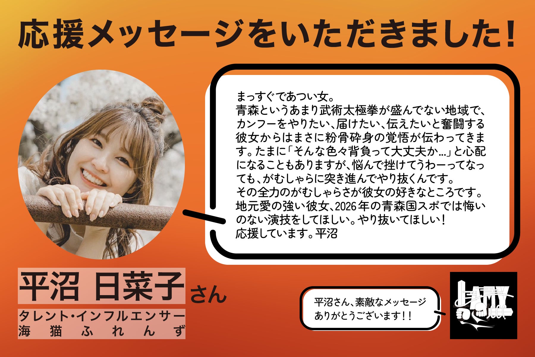八戸にUターンして4年間。たくさんの人が、私や武術太極拳競技を応援してくれて、支えてくださっているからこそ、私は地方で、本プロジェクトに挑戦することができました。
