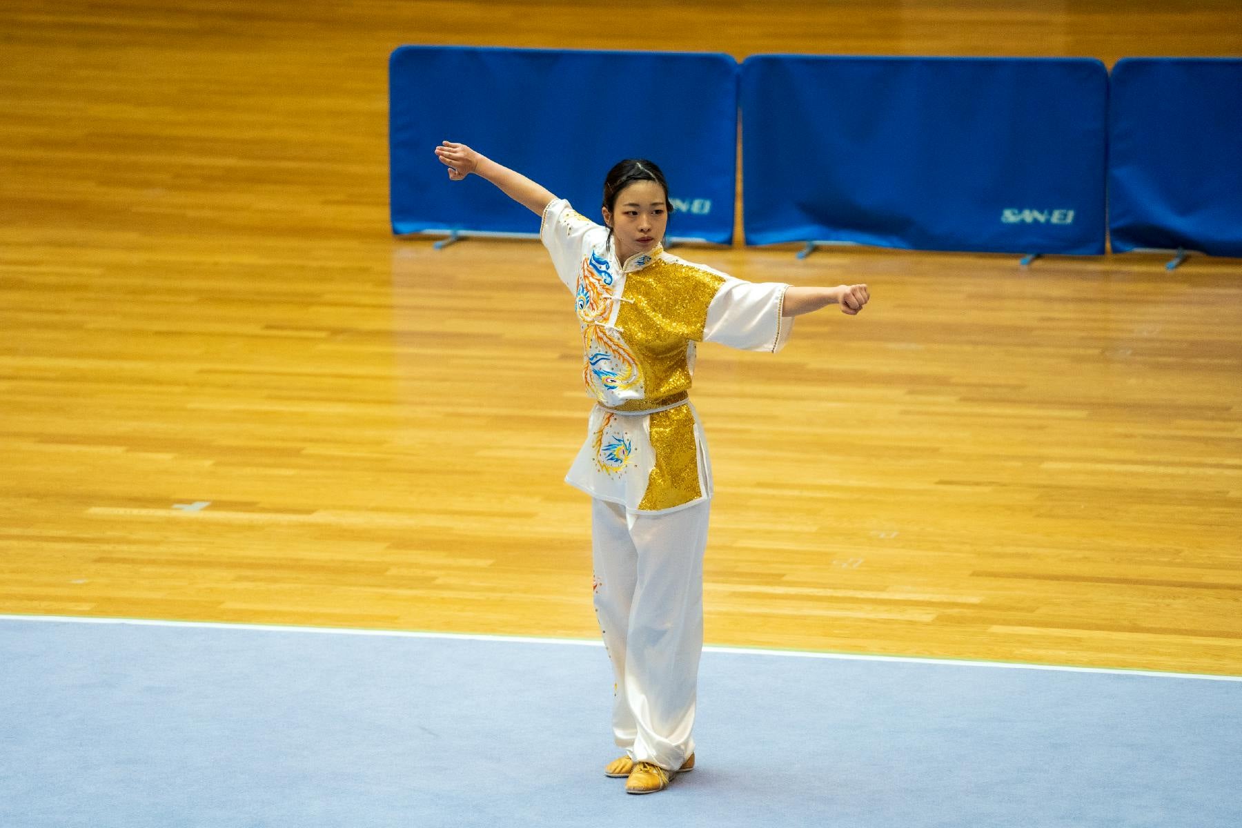 武術太極拳は、演武を見せて点数をもらう表現スポーツです。14m×8mの競技コート上で1人で演武します。ペア種目や集団種目もありますが、基本的には個人の戦いです。空手の型や器械体操の床などの形式に似ていると思います。