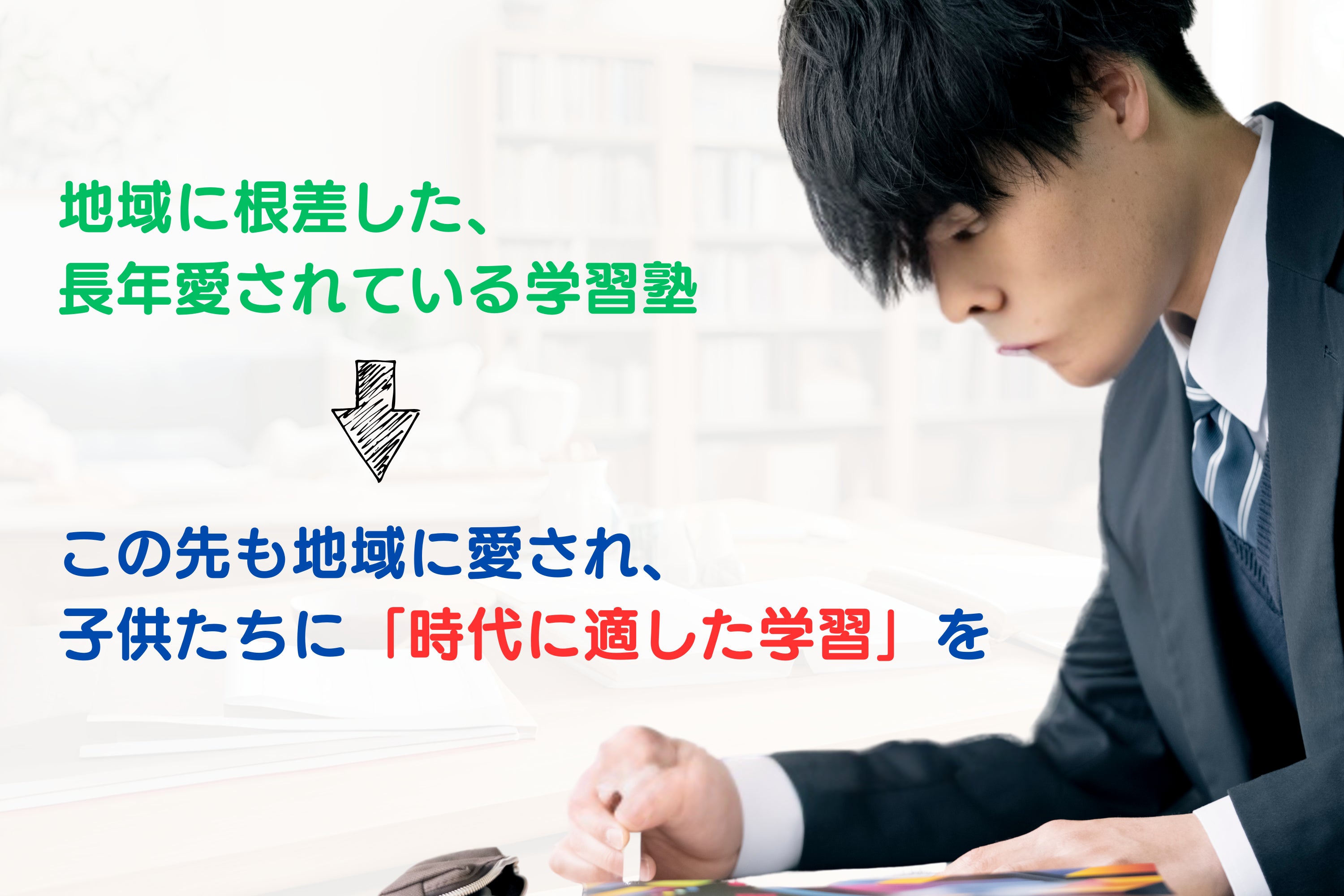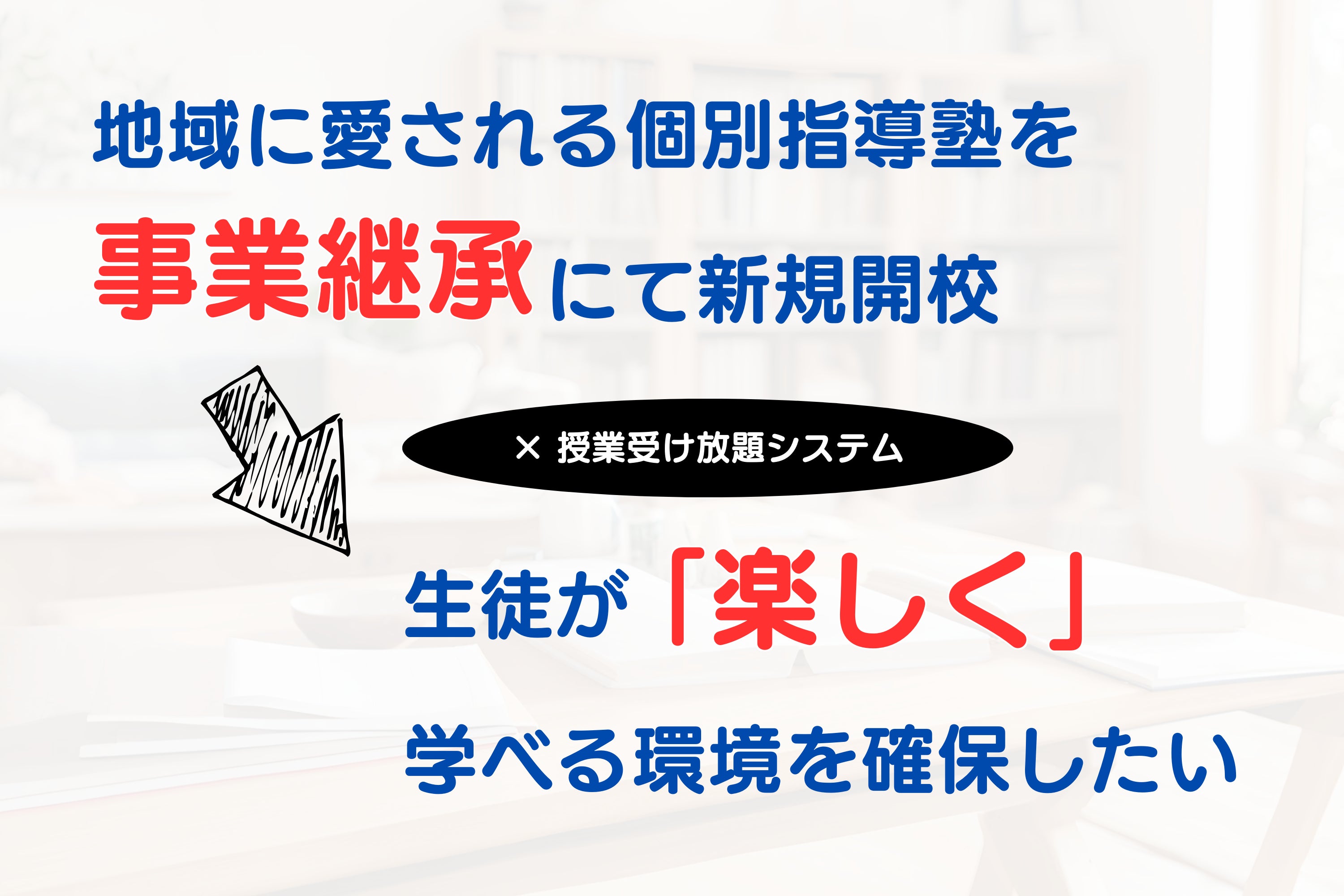 今まで何十年と地域に根差して運営されてきた学習塾でありながら、後継者がいないために閉塾を考えられている経営者様から「事業継承」という形で経営を引き継がせていただき、地域に愛される学習塾を再建します。