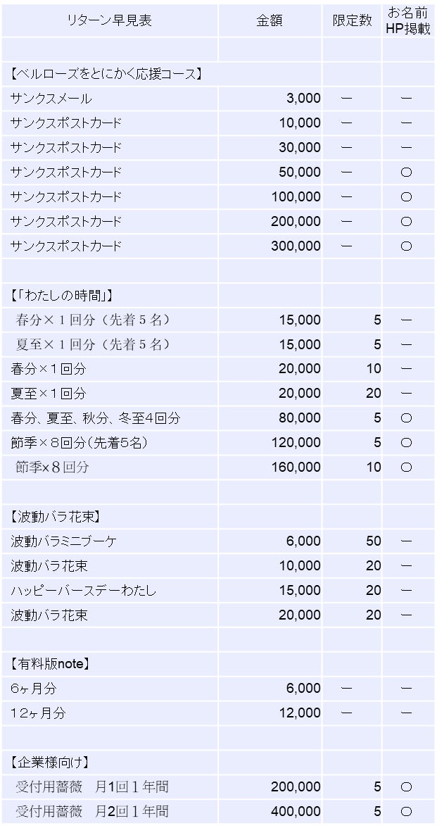 2026/03/04 07:00ベルローズです。昨年はCAMPFIREでの応援を本当にありがとうございました。あの時間は、資金だけではなく「ひとりじゃない」と思える心の支えでした。そしてこの一年でいちばん大きかったのは、返礼品を受け取ってくださった方の言葉や、ワークショップ・集いで交わした時間を通して、“共に支え合う輪”が生まれたことです。また、<応援>「ハッピーバースデーわたし」をお申し込みくださった方から、「自分の誕生日に花束が届く幸せを、深く味わっています!」というような喜びのメッセージを多くいただきました。さらに「今年もお願いします!」というお声も。その一言一言が本当に嬉しくて、改めてこの輪を「続いていく“場”」として育てていきたい気持ちが強くなりました。今年は、その「ベルローズの輪」を途切れさせずに、支援で終わりにしない「続いていく“場”」として育てていくために、個人様・法人様向けの【応援購入】を用意しました。応援方法は、3つあります。① 花で応援:<応援>「ハッピーバースデーわたし」 —「わたしを祝う日」を、波動バラとともに(ギフト直送も承ります)② 配送なしで応援:<応援>「支援の輪」(1口1,000円/何口でも可) —返礼品は不要だけれど、輪を支えたい方へ(お礼メッセージをお送りします)③ 企業様の応援:ベルローズ協賛(スポンサー) —社名掲載(任意)などで、企業として“場”を支えていただけます▼今年の応援特集ページ(お申し込みはこちら)https://bellerose.jp/page-8277受付期間:2026年2月19日〜3月31日 23:59無理のない形で、ベルローズの仲間になっていただけたら嬉しいです。改めて、昨年のご縁に心から感謝しています。今後とも、どうぞよろしくお願いいたします。 もっと見る発送のご報告|「わたしの時間~秋分」をお届けしました