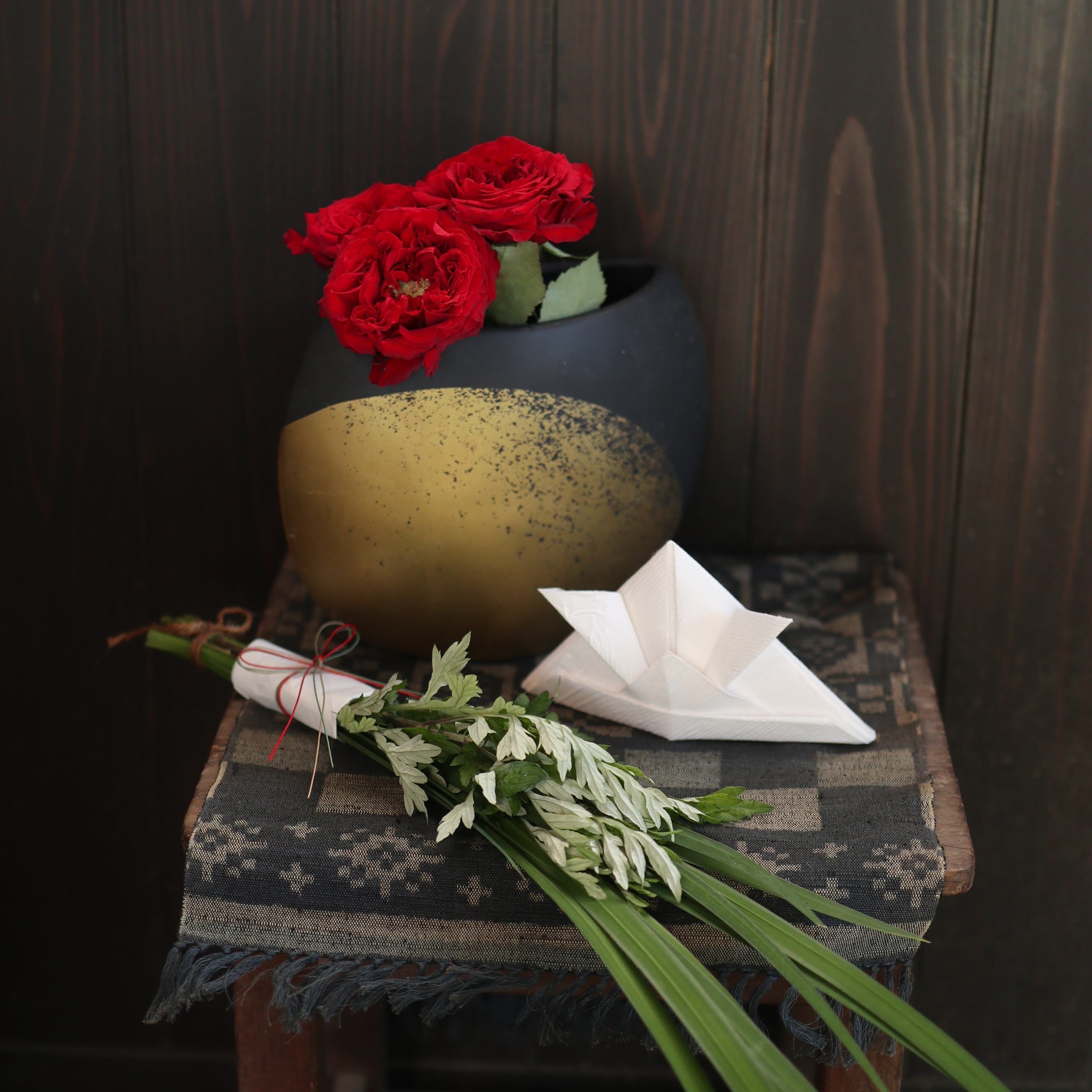 クラウドファンディングのリターンとしてお届けしている「わたしの時間」。5月・立夏の便には、波動バラとともに、季節の室礼として「軒菖蒲」と「和紙の兜」を添えてお送りしました。