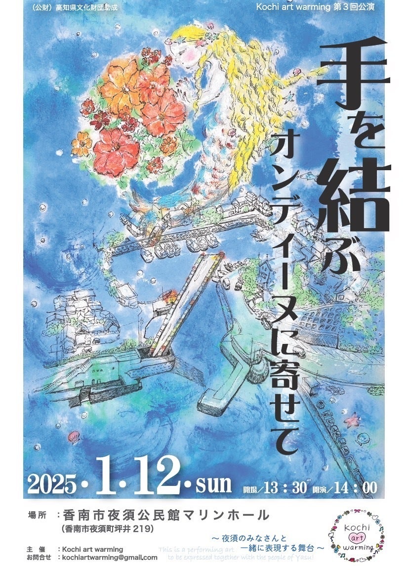 私たちkochi art warming(高知アートウォーミング)は2020年から、「アートで心をあたためる」をテーマに、高知で活動するダンス(バレエ、ジャズ、ストリート)+音楽(クラッシック、ポップ、ワールド)+演劇+建築+絵画+写真+デザインなど、ジャンルを超えたメンバーが集まって県内各地で舞台公演やこども向けアート体験イベントなどを実施しています。