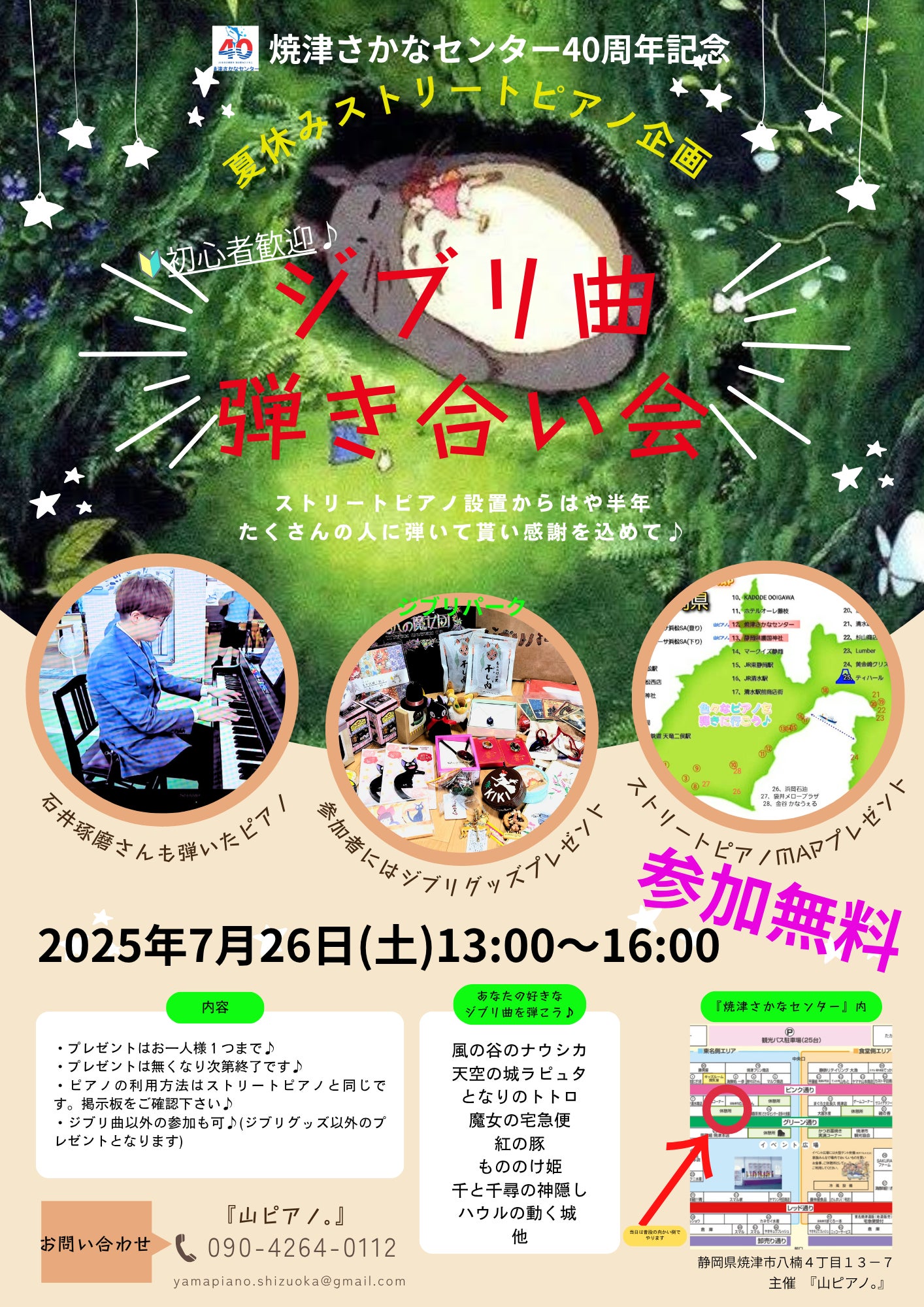 焼津さかなセンターに7月12日石井琢磨さんが!7月26日にジブリ曲イベント開催します