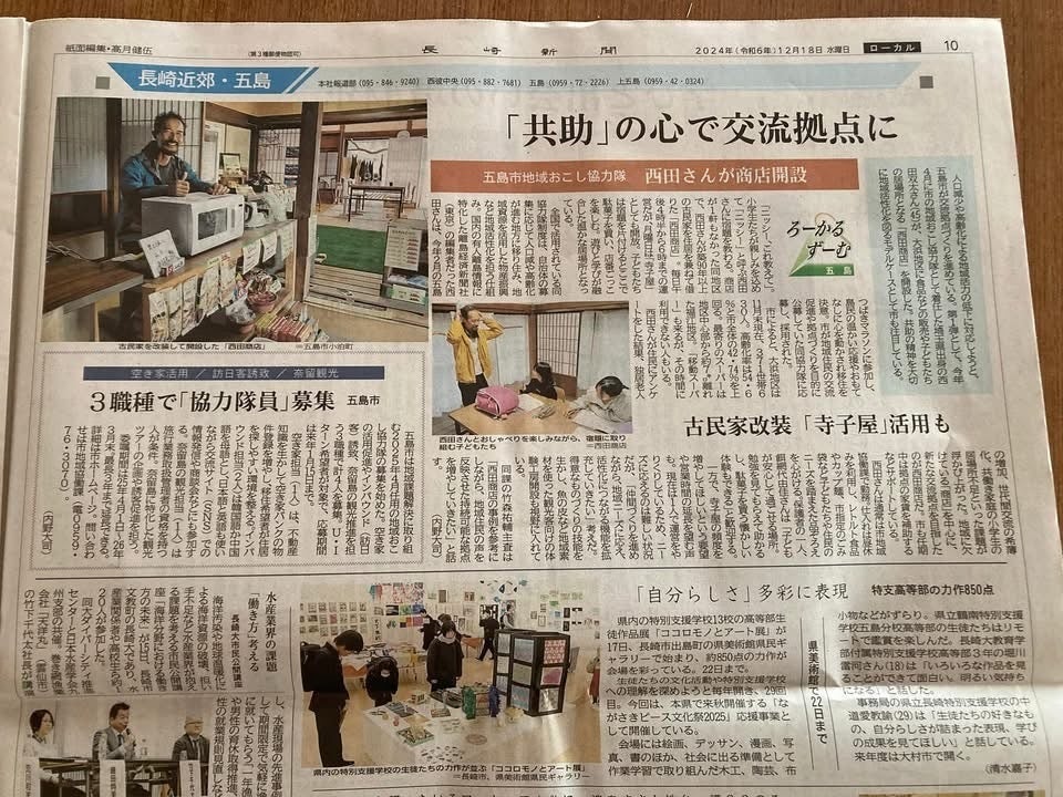 先日、自分の活動を長崎県の新聞に掲載していただけました。商店がなくなり、学校が廃校になった地域に、自宅をDIY改装して「商店」と「寺子屋」を兼ねた複合施設「西田商店」を開設しました。※掲載された新聞記事は、以下のURLからご覧いただけます。五島市地域おこし協力隊 西田さんが商店開設 古民家を改装、「寺子屋」活用も 長崎https://www.nagasaki-np.co.jp/kijis/?kijiid=3d79a2e9d5714c5389fc6ce0d8439c26ここから地域の交流拠点づくりとともに、今回新たな挑戦として「地域の交流拠点をつくるためのクラウドファンディング」を始めました。お気に入り登録や情報の拡散、ご支援のほど、どうぞよろしくお願いいたします。