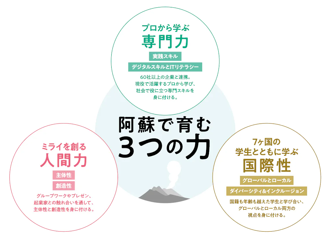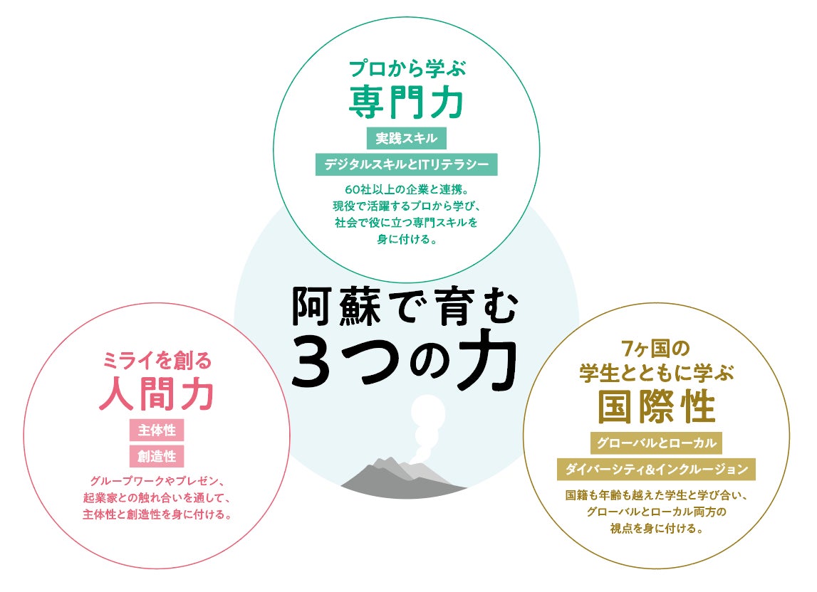 『専門力』『人間力』『国際性』を教育の柱とし、阿蘇全体をキャンパスと捉え、グローバルとローカルの視点を持ち、ITを活用して地域社会の未来を創る人材育成に取り組んでいます。