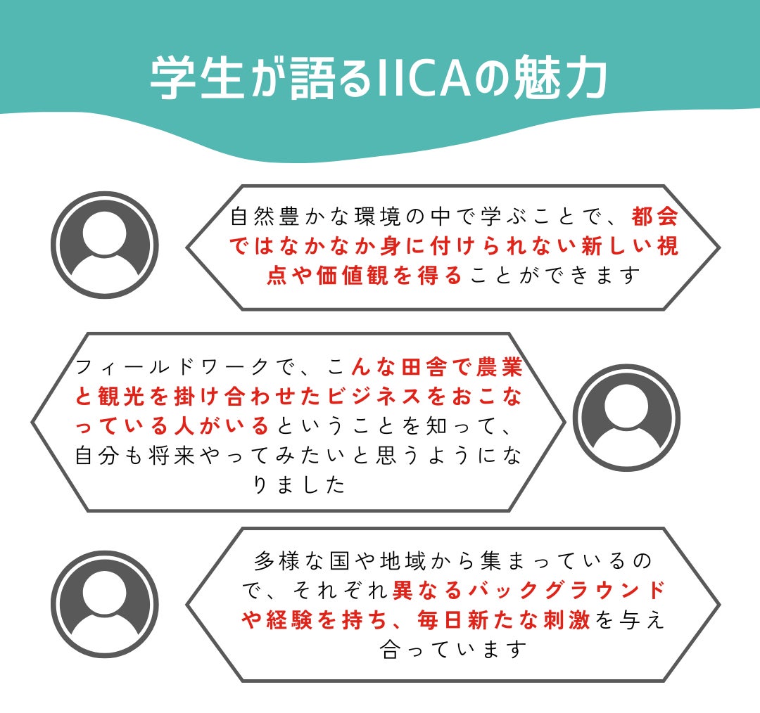 IICAは自然の中でITや観光の専門的知識を学びながら地域と関わり、学生間同士の異文化交流、学んだ知識を元に社会へ活かしていく体験が豊富にできる場所です。少子化問題が顕著化している中で、国内学生と留学生が共に学び、培った知識と才能を活かして将来社会の一員として活躍する若者達を応援したいと思います。