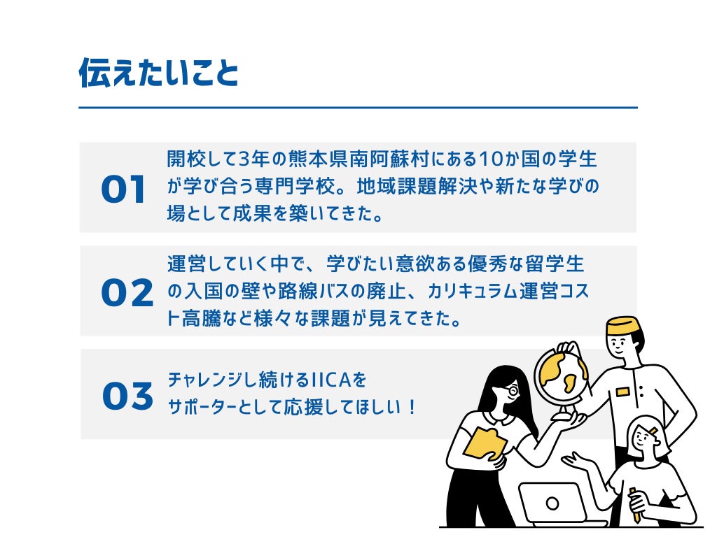 「観光」と「IT」は地域を元気にするキーワードです。そのキーとなるのは「人材」です。観光やIT産業を、自らが起点となって担っていく「人材」を、南阿蘇の地で育成し、世界に送り出すIICAの教育活動を応援しています。
