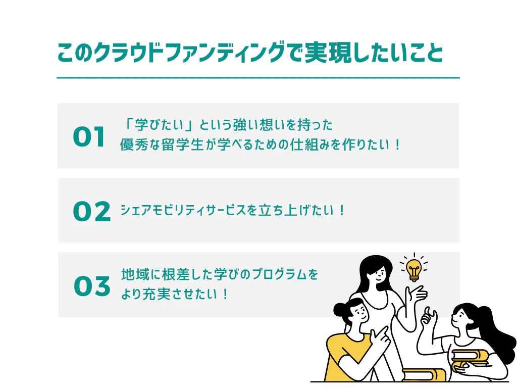 私たちがこのクラウドファンディングを通して実現したいことは、3つあります。