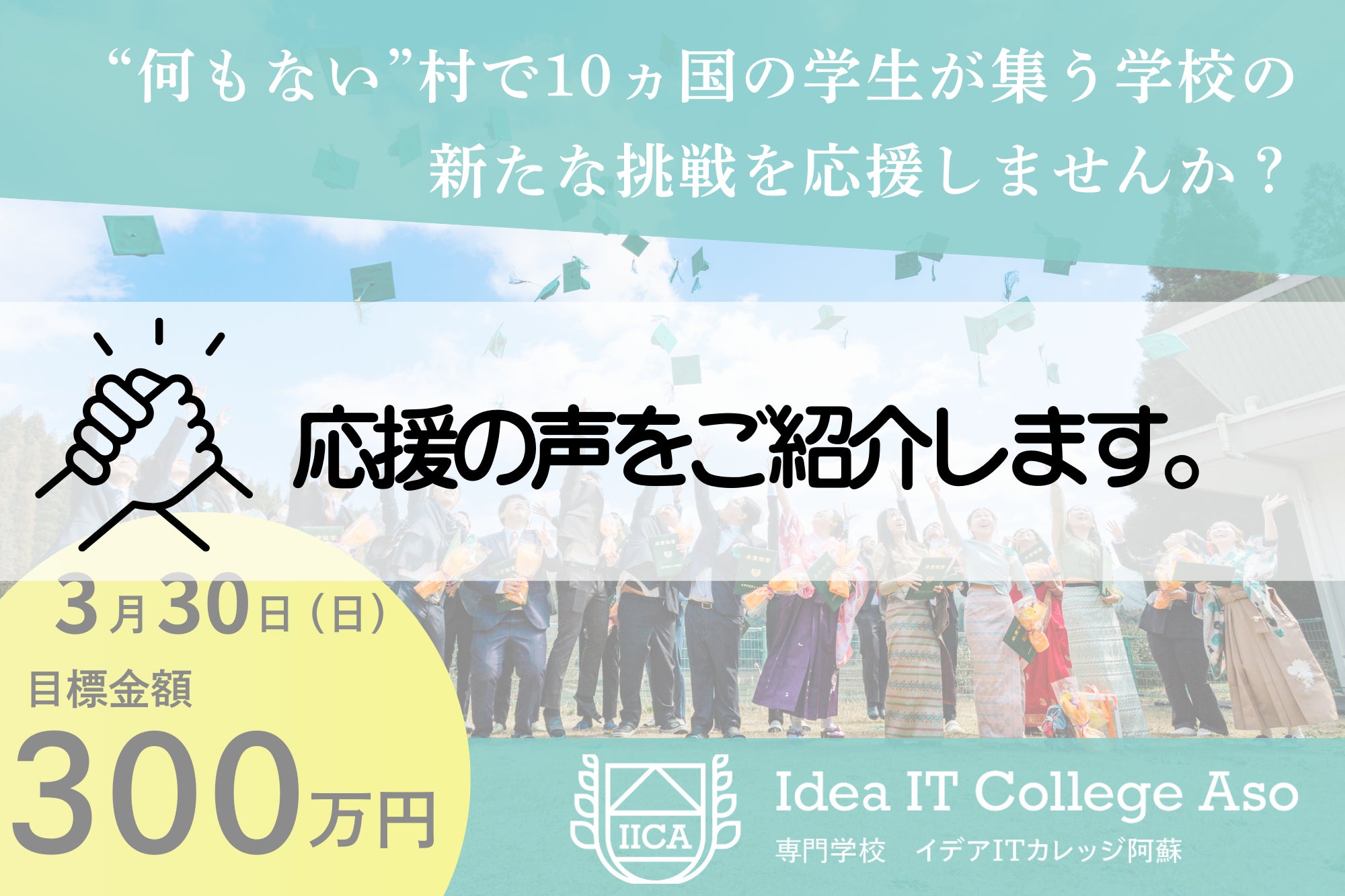 2025/03/01 15:11IICAの活動を応援するコメントが届いておりますのでご紹介いたします。引き続き、IICA活動の応援・ご支援をよろしくお願い申し上げます。現在、クラウドファンディング応援企画として、SNSでのシェア祭りを実施中です!ぜひ、シェアによる応援もお願いいたします!\簡単1ステップ!参加方法/①各種SNS(facebook、Instagram、X、Threads)で下記のクラファン投稿をシェアする。クラファン投稿はこちら↓・facebook:https://www.facebook.com/share/p/1X1qMJNb6Y/・Instagram:https://www.instagram.com/p/DF7M_VcPg4W/?igsh=NTdvaHl3NXY0enYx・X:https://x.com/IdeaAso/status/1891811588140585013・Threads:https://www.threads.net/@ideaitcollegeaso/post/DGNmX1wPYcv?xmt=AQGzQ_I45g8j5km_m8xr71TMBjF-aWdgYXQ7T56Fn_YnIg★シェアする際に、応援コメントを付けていただけると大変嬉しいです!例)活動を応援しています!今回のクラファンを支援しました!IICAサポーターとして、見守っています!などなど。シェアという1分でできる応援を集め、まだ私たちの挑戦を知らない人たちに情報を届けていきましょう!ーーークラウドファンディング挑戦中です!開校3年、“何もない”村で10ヵ国の学生が集う学校の新たな挑戦を応援しませんか?https://camp-fire.jp/projects/812308/viewぜひ、これまでの活動や成果も含め、ご覧ください。ーーー もっと見る
