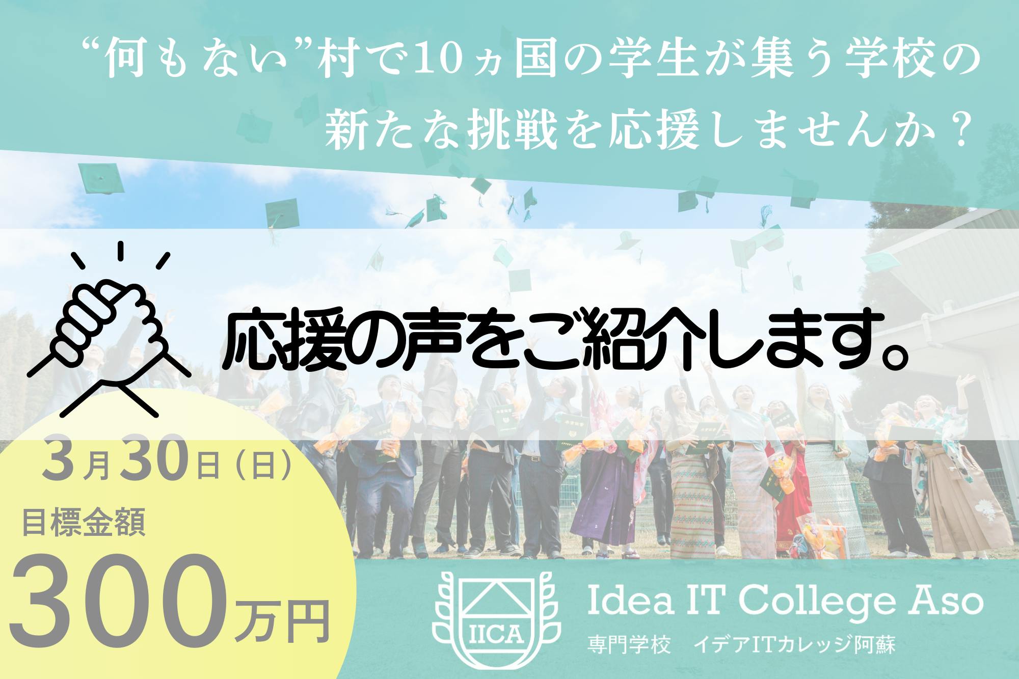 2025/02/27 09:13今日までに27人のみなさまより、49万円のご支援をいただき、誠にありがとうございます。多くの方々に、私たちの挑戦を応援していただいていること、大変嬉しく思います。さて、今回のクラウドファンディングへの挑戦期間も折り返し地点が迫ってきました。目標金額300万円までは、達成率16%と、まだまだ道半ばです。ここからの後半戦で、もっと多くの方に私たちの取り組みやチャレンジを知っていただきたい!と思い、みなさんと一緒に”一斉にクラファンについての投稿をSNSで拡散する『シェア祭り』”を開催したいと思います。\簡単1ステップ!参加方法/①各種SNS(facebook、Instagram、X、Threads)で下記のクラファン投稿をシェアする。クラファン投稿はこちら↓・facebook:https://www.facebook.com/share/p/1X1qMJNb6Y/・Instagram:https://www.instagram.com/p/DF7M_VcPg4W/?igsh=NTdvaHl3NXY0enYx・X:https://x.com/IdeaAso/status/1891811588140585013・Threads:https://www.threads.net/@ideaitcollegeaso/post/DGNmX1wPYcv?xmt=AQGzQ_I45g8j5km_m8xr71TMBjF-aWdgYXQ7T56Fn_YnIg★シェアする際に、応援コメントを付けていただけると大変嬉しいです!例)活動を応援しています! 今回のクラファンを支援しました! IICAサポーターとして、見守っています!などなど。シェアという1分でできる応援を集め、まだ私たちの挑戦を知らない人たちに情報を届けていきましょう!ーーークラウドファンディング挑戦中です!開校3年、“何もない”村で10ヵ国の学生が集う学校の新たな挑戦を応援しませんか?https://camp-fire.jp/projects/812308/viewぜひ、これまでの活動や成果も含め、ご覧ください。ーーー もっと見る