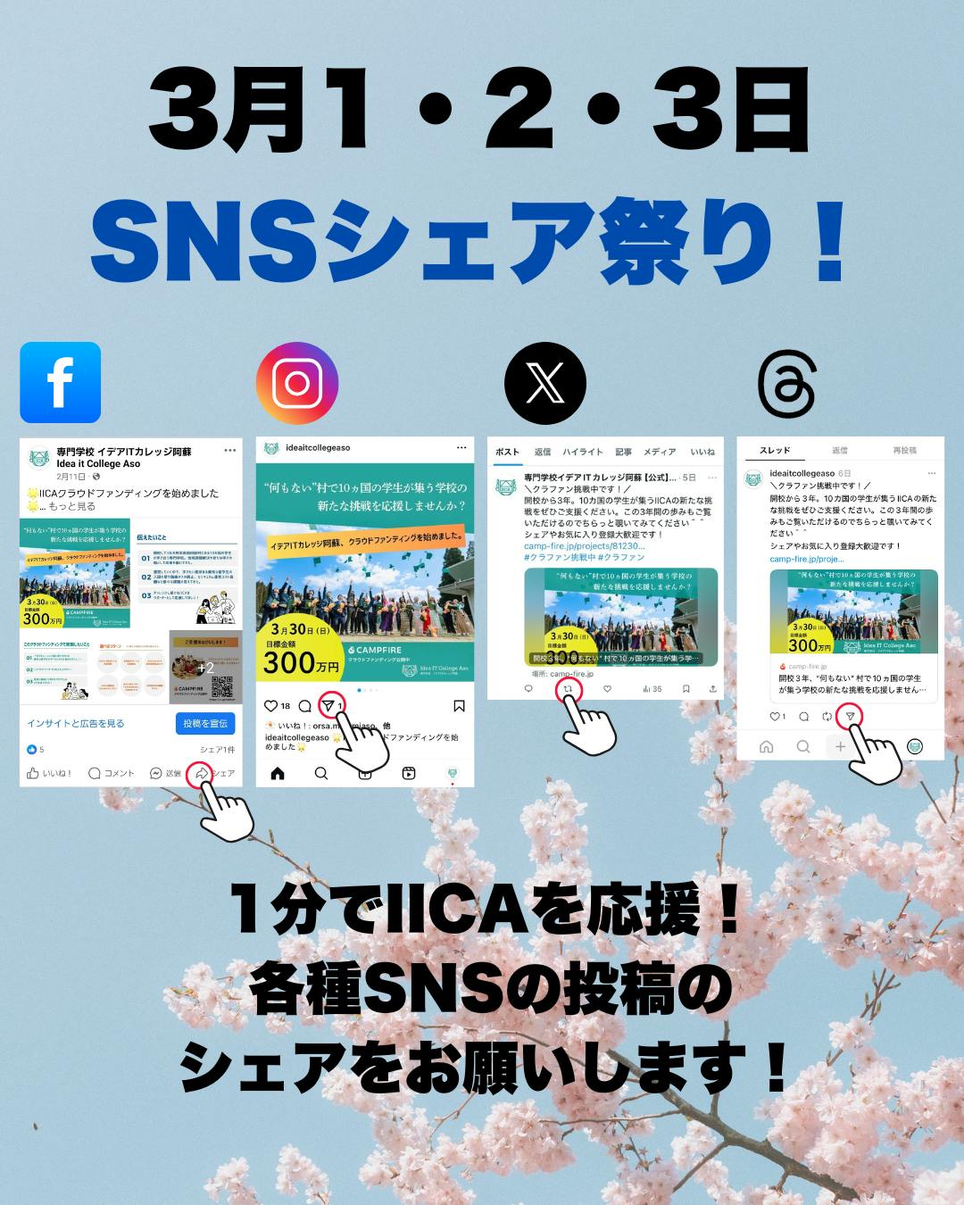 ①各種SNS(facebook、Instagram、X、Threads)で下記のクラファン投稿をシェアする。