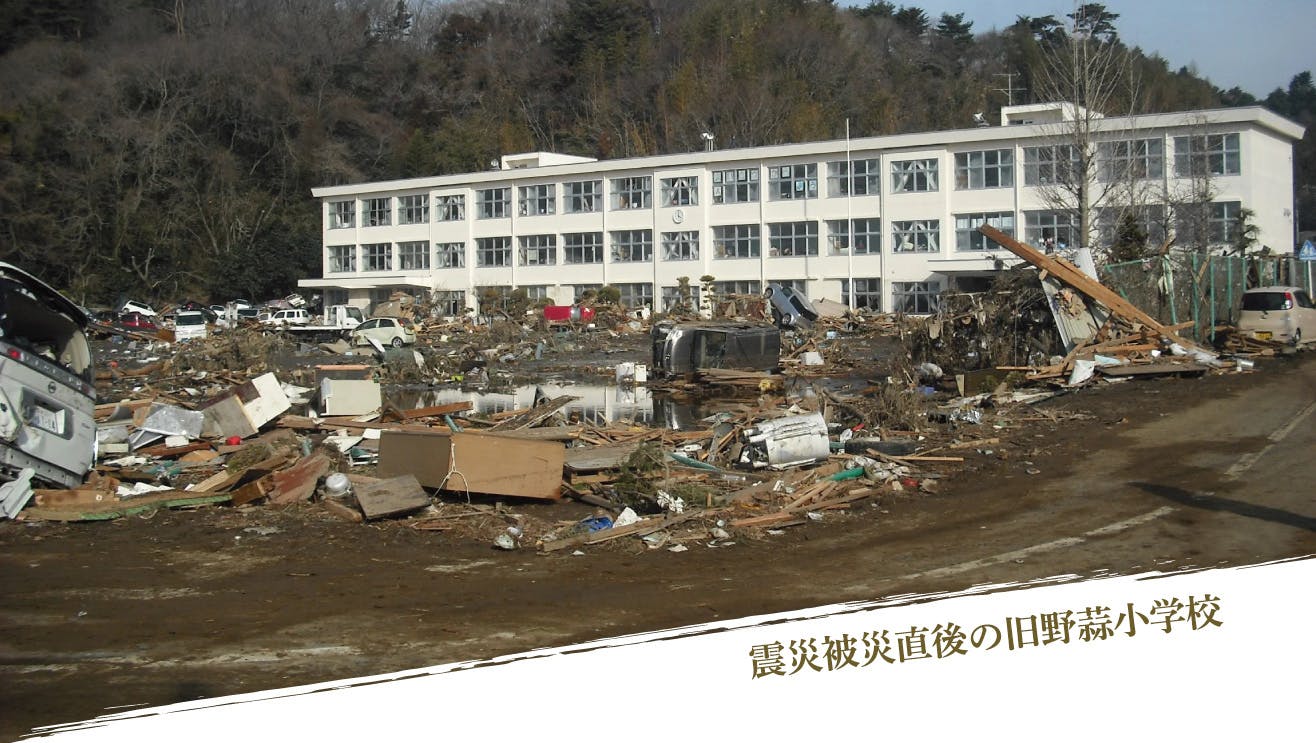 当時の野蒜小学校は津波災害の傷跡がそのまま残った状態で、この状態から復旧できるのか? というくらいの状態でしたが、だからこそ私は、この寂しい学校のままではなく、この場所を再建し、笑い声が絶えない学舎に戻したいと強く思ったのです。縁もゆかりも無かった東松島市、でもこの場所を明るく元気に未来に向かう野蒜小学校に戻したかったのです。