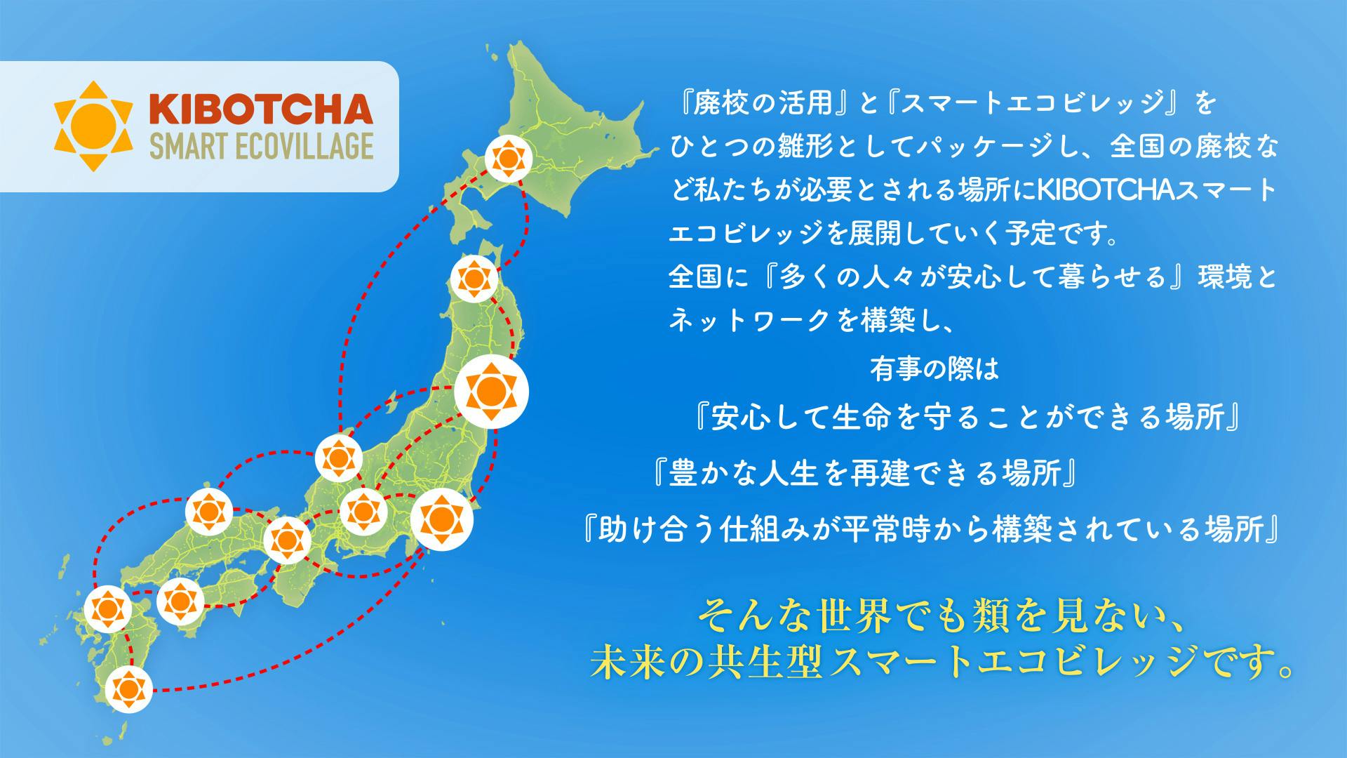これまで育み築き上げてきたKIBOTCHAとその可能性をさらに押し進め、より多くの人が安心して生きられる環境とコミュニティーをつくり、未来の生活モデルを提案していきます。