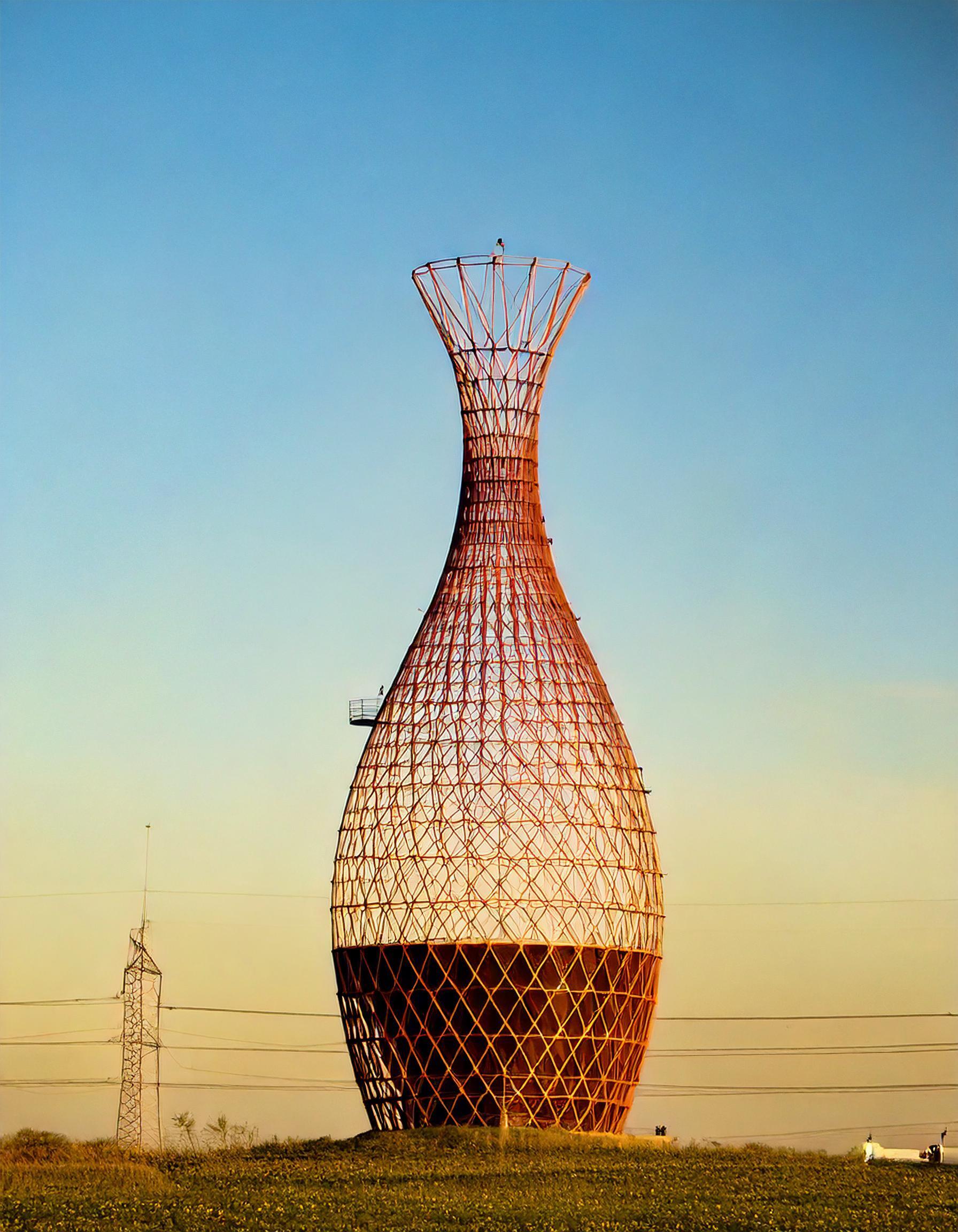 これはイタリアの建築家チームが研究開発していて、重力、凝縮、蒸発などの自然現象のみを利用し空気中から水を集める、電力を必要としない竹製の「給水塔」。