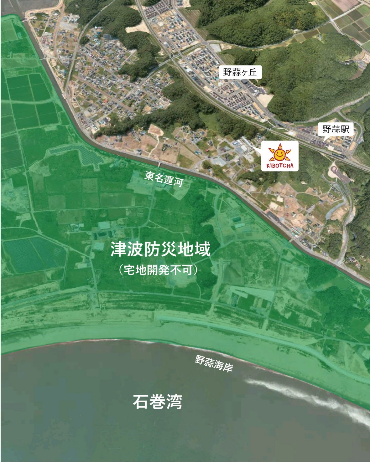 元々は集落などがあり、⺠家が立ち並んでいた、TOPの図のオレンジで囲われた野蒜海岸沿いのエリアは、 東日本大震災後に「津波防災地域」に指定され、宅地の再開発が認められなくなったため、かつて海水浴場として賑わっていた美しい観光資源があるにも関わらず、ほぼ手付かずの状態のままとなっています。