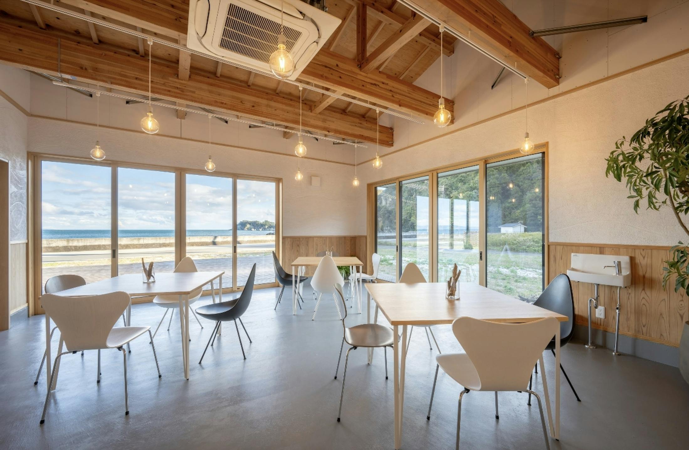 奥松島の美しい景色に囲まれたRISE BEACH OKUMATSUSHIMAのカフェ施設を、貸切でご提供いたします。石巻湾、日本三渓「嵯峨渓」の美しいランドスケープを目の前に、大人数でのイベントやリラックスできるスペースとしても最適です。