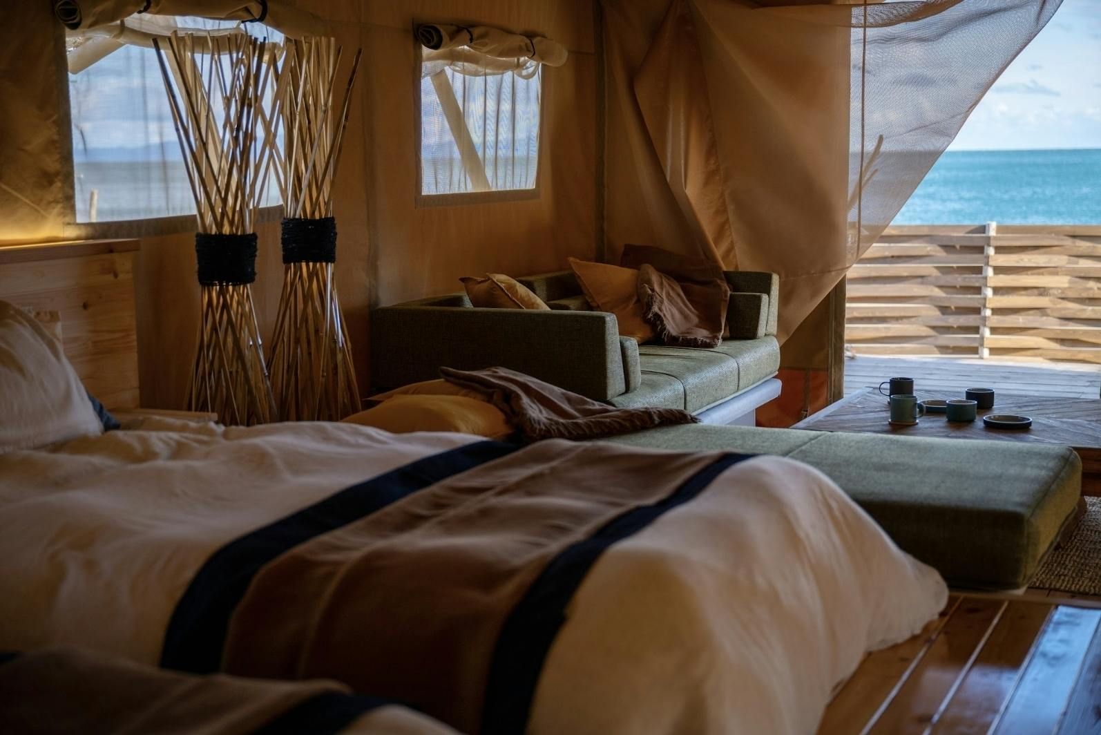 本場のサファリテントを使用したグランピングは、自然の中に溶け込む感覚を味わうことができ、波の音や海の香り、そよぐ風や雨の音を聞きながら、のんびりと何もしない贅沢を味わえます。星空のもと波の音をBGMに究極のリラックスをお楽しみください。