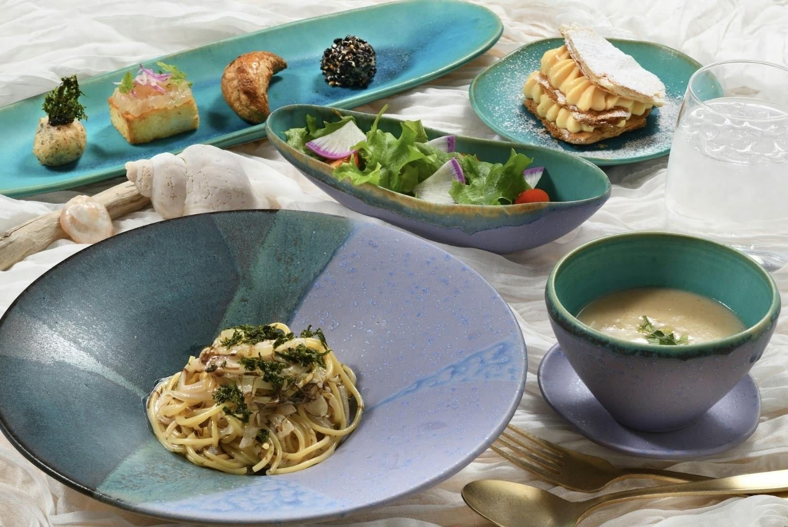 RISE BEACHのレストランで提供させていただくお食事は、漁師まちならではの新鮮な魚介類をはじめ、シェフ厳選の自然栽培による地域の食材を使用したお料理が並びます。