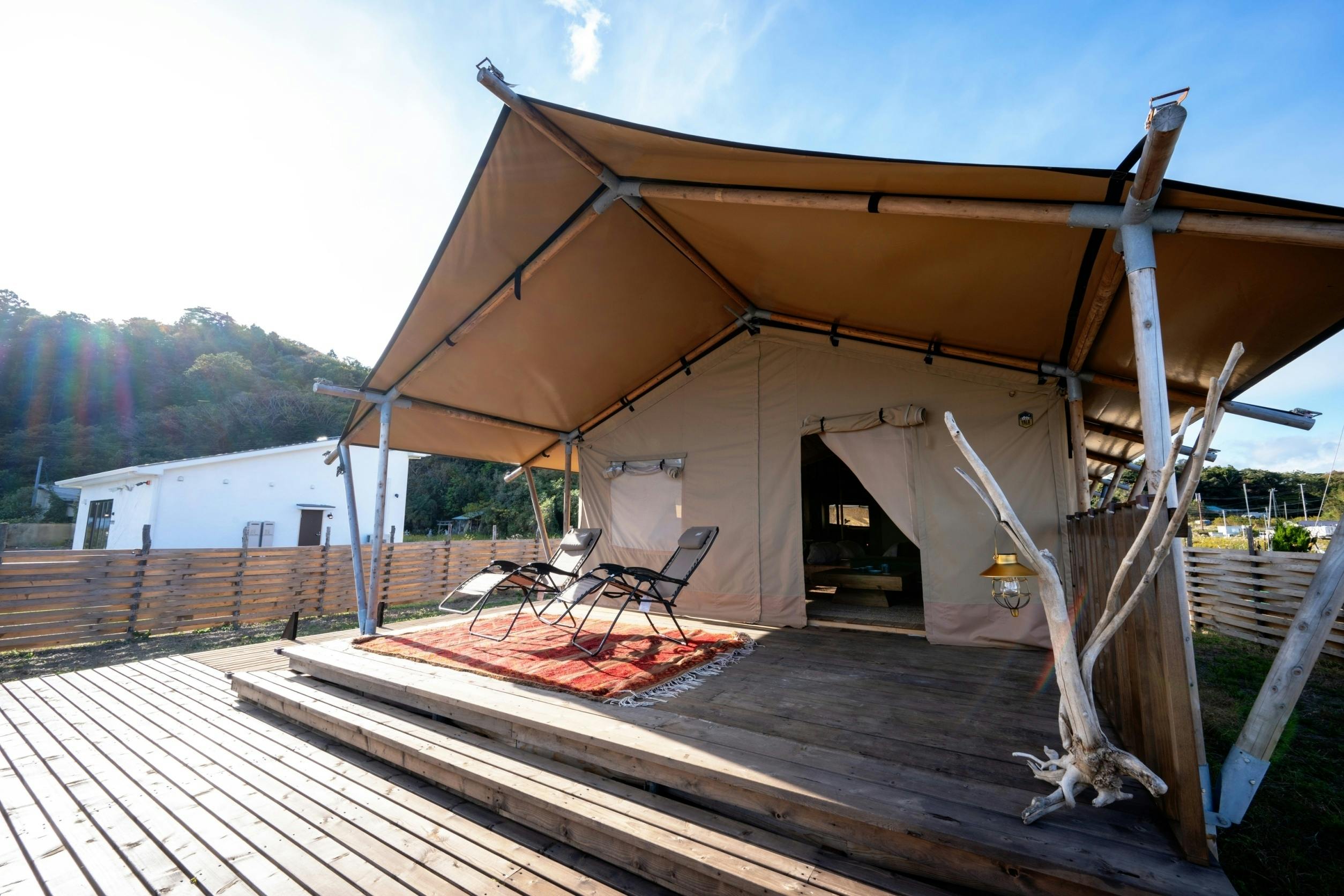 グランピングでは、本場のサファリテントを使用することで、自然の中に溶け込む感覚を味わうことができ、波の音や海の香り、そよぐ風や雨の音を聞きながら、のんびりと何もしない贅沢を味わえます。夜は、星空のもと波の音をBGMに心地よいひとときをお過ごしください。