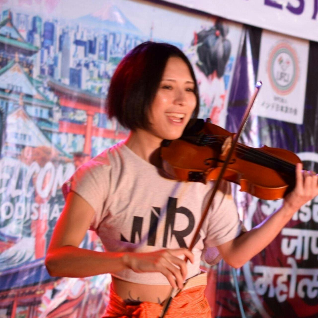 an electric violin player. バイオリンとヨガマットを持って世界を旅するバイオリンプレイヤー。