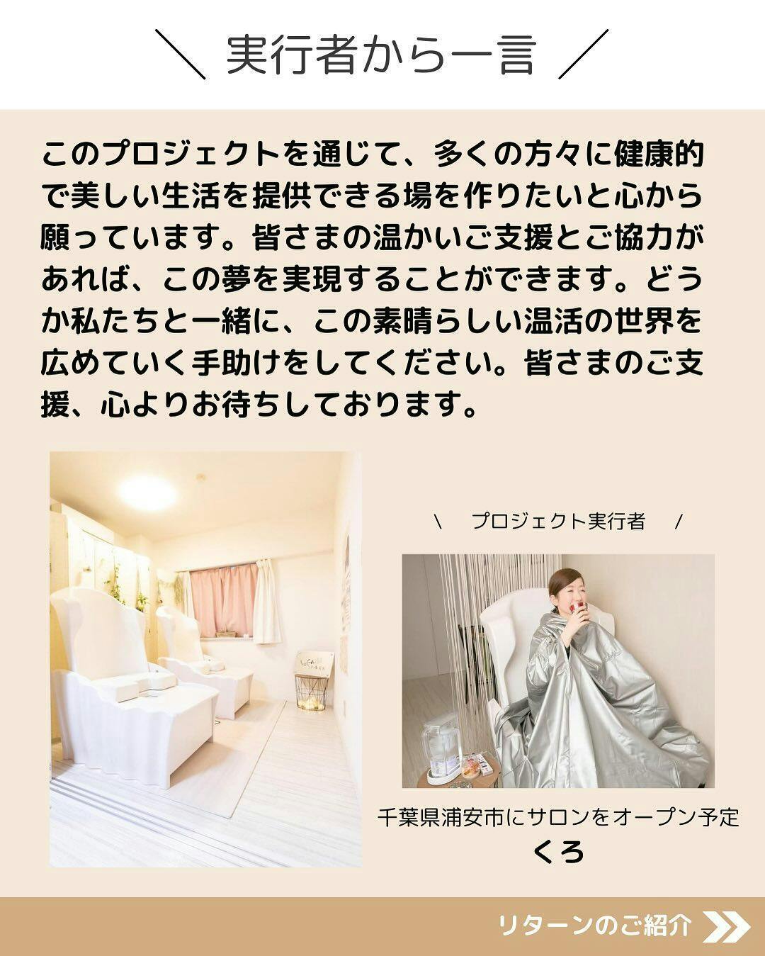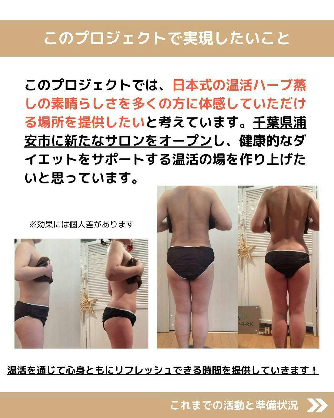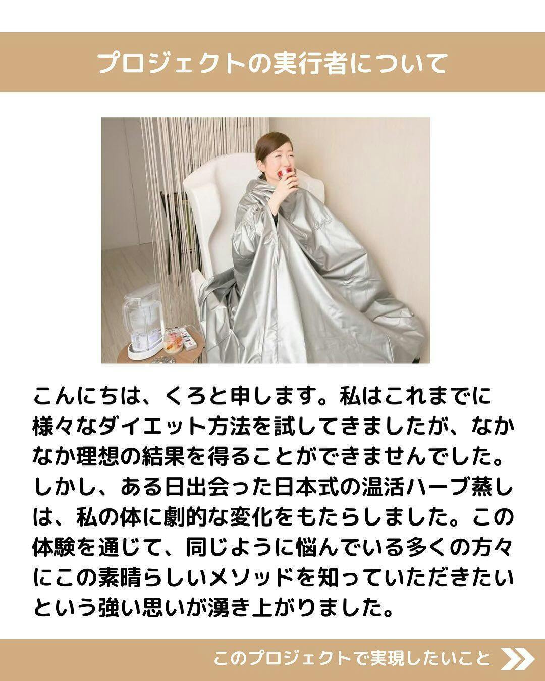 痩身エステや脂肪吸引など、これまで様々な方法を試してきましたが、なかなか思うように痩せることができずに悩んでいました。そんな中、日本式の温活ハーブ蒸しと出会い、その効果に驚かされました。この感動をより多くの人と共有したい、そして同じように悩んでいる方々の力になりたいという思いから、このプロジェクトを立ち上げることを決意しました。多くの方々が健康的に美しくなれるようにサポートしていきたいと考えています。
