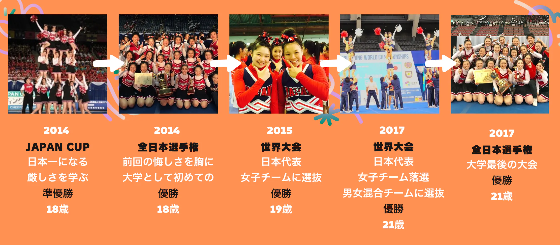 名門の帝京大学 BUFFALOS(バッファローズ)に進学し、チアを続けて全日本学生選手権大会では2度優勝。日本代表にも2度選抜され、どちらとも優勝を経験しました。