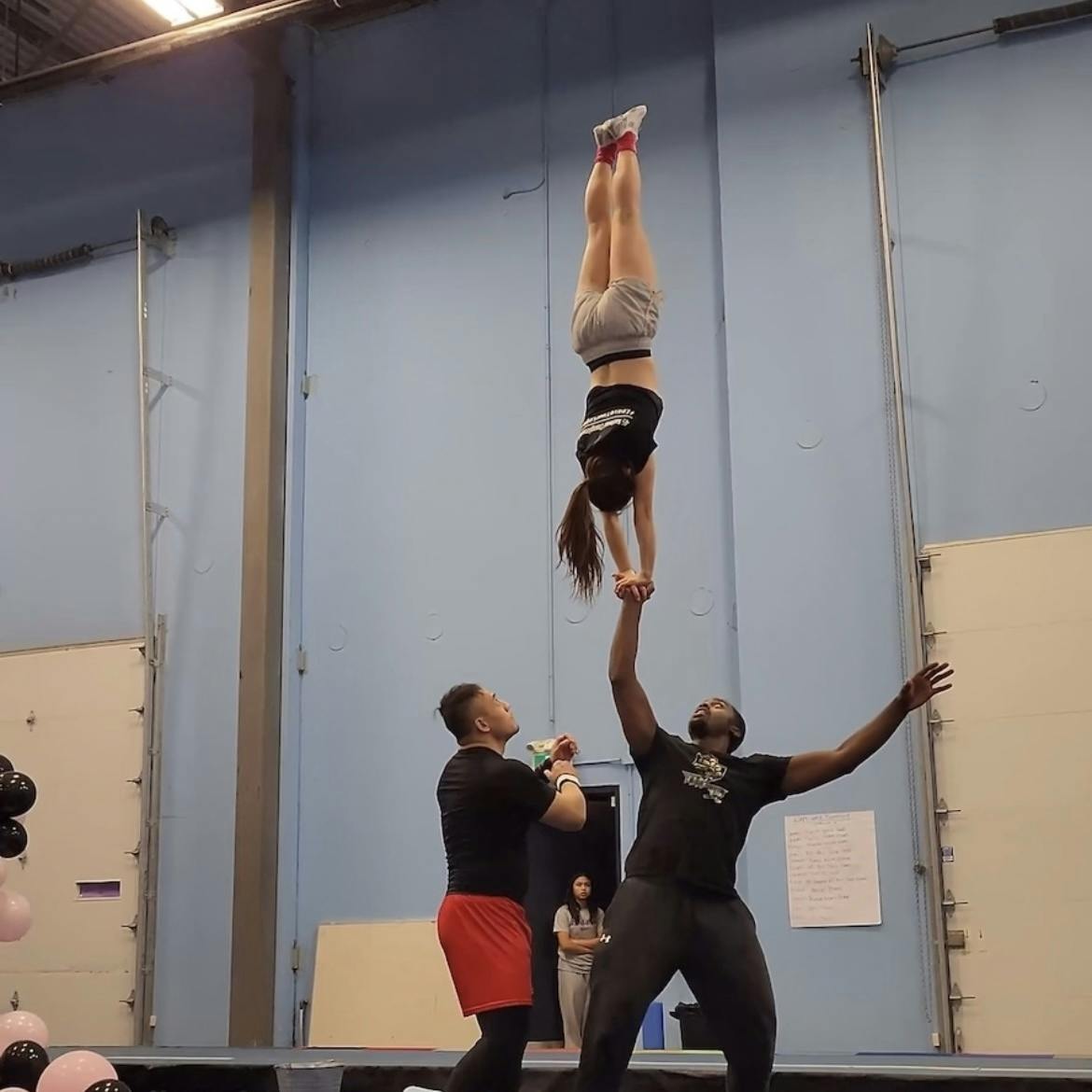 空中で一回転したあとに脚を大きく開いてから、人の上に立ったり。