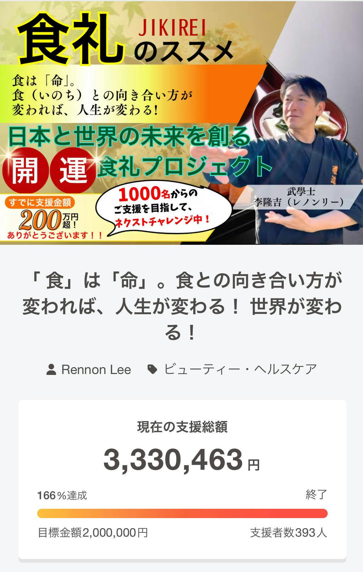 2025/04/21 08:15食礼クラウドファンディングが終了しました。支援総額3,330,463円、支援者数393人、目標金額2,000,000円に対して達成率166%となりました。ご支援ありがとうございました。ご支援していただいた方には、順次リターンの発送をしてまいります。(一部発送済、実施済のリターンもございます)今後食礼プロジェクトは、みなさまのご支援を受けて、・オンラインプログラムの開発・食礼道場の設立を始め、世の中に食礼を普及していくことでよりよい世界を創ることに貢献していきます。食事は毎日のことであり、食礼はその食事の時間をよりよい時間にしませんかという提案です。今後、食礼プロジェクトの進捗報告や企画などを随時案内させていただきますので、よろしくお願いします。このご縁を大切に進んでいきます。ありがとうございました。 もっと見る
